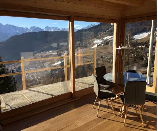 The chalet is located at 1,700 meters a.s.l. . Classic in appearance, but revisited in a modern key with innovative materials; large windows on the south-east and west sides and a spruce and larch wood paneling on the north side.