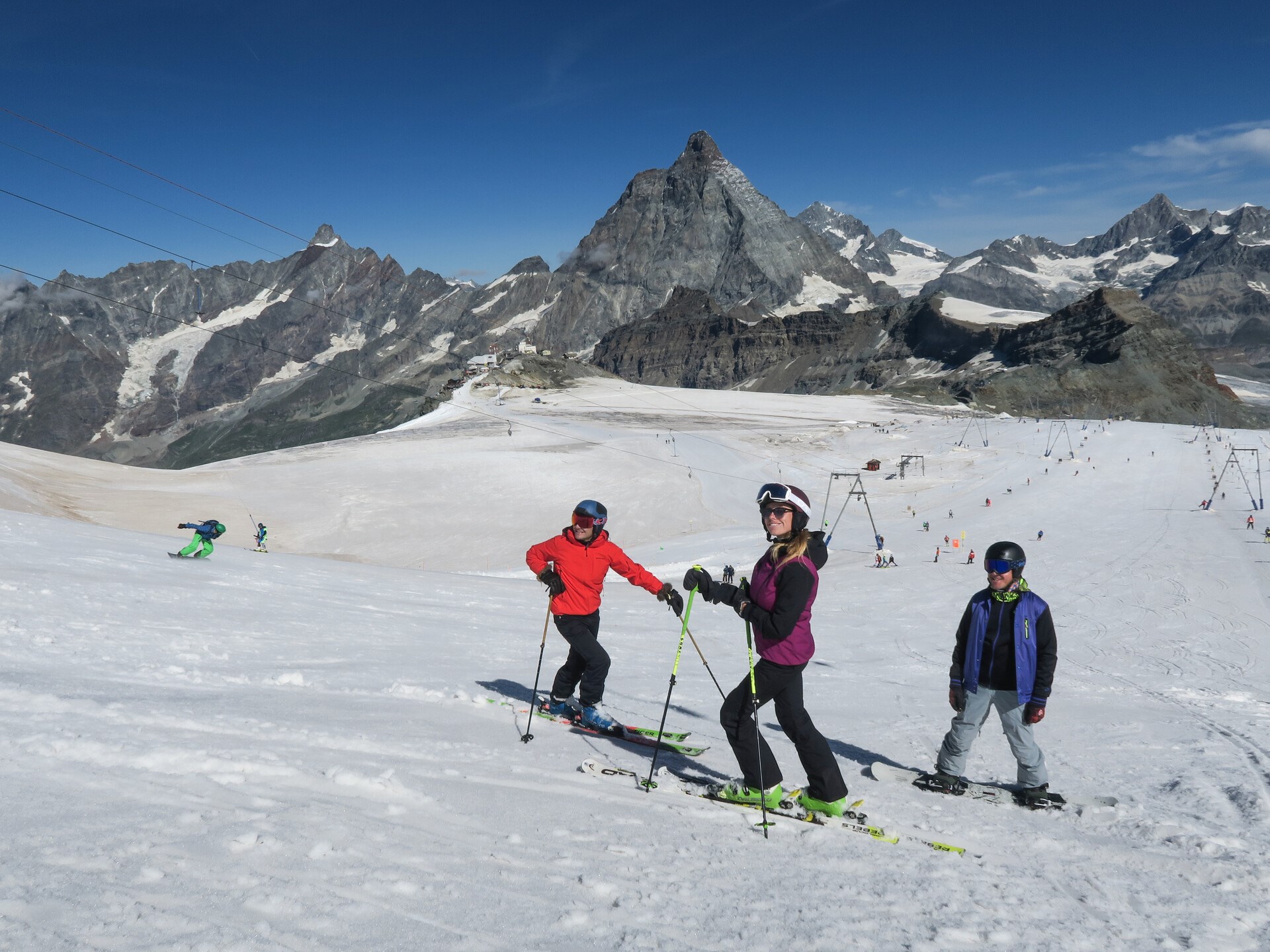 Skifahren kann man in der weiten und sonnigen Mulde, die eben Plateau Rosà ist, und in der Schweiz mit den Schleppliften, der Bergbahn Kleinmatterhorn ( 3.883 m.) und der Anlage Matterhorn Alpine Crossing ( im internationalen Ticket ist nur die Hinfahrt inbegriffen.)