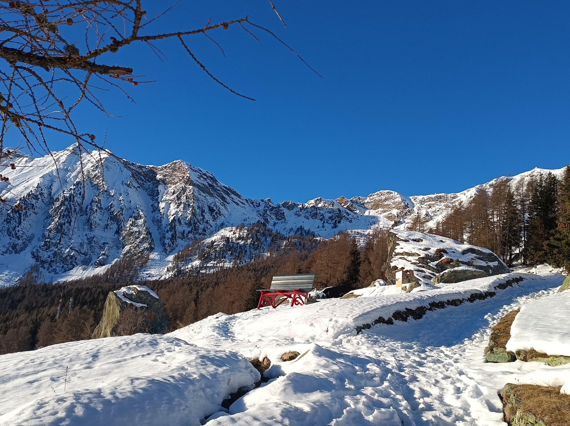 Der Schneeschuhausflug beginnt am Rathaus von Ayas, direkt oberhalb der Pfarrkirche von Antagnod. Die Wegnummer des Weges ist 105, der zwischen Nadelbäumen hinaufführt, bis man den kleinen Weiler Barmasc erreicht, der Wanderer mit einer der mittlerweile berühmten „Big Bench“, farbenfrohen Riesenbänken, begrüßt.