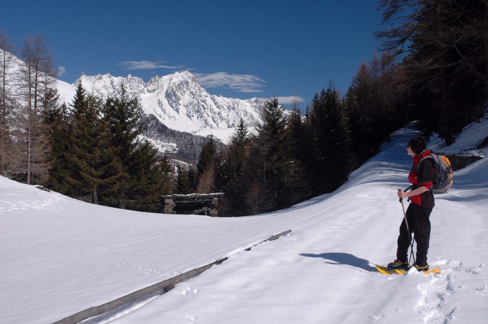 In Pera Carà stößt man auf eine Weggabelung mit einem Markierungspfosten: man folgt den Hinweisen in Richtung Cretaz, Wanderweg 2B und läuft ein kurzes Stück die asphaltierte Straße entlang. Nachdem man auch eine Beschreibungstafel mit den Erklärungen der Winterroute hinter sich gelassen hat, kommt man an das Schild mit dem Verkehtsverbot und schnallt sich dort die Schneeschuhe an. Nun geht es die verschneite Piste durch den Lärchen- und Rottannenwald bergauf. Unterwegs kommt man an einigen Beschreibungstafeln vorbei, auf denen einige Aspekte des Winterwandersports erläutert werden: es werden Hinweise zur Natur gegeben und einige Sicherheitsvorkehrungen in den Bergen erklärt. Auf mehreren Kehren geht es den Hang hinauf, der dadurch etwas weniger steil erscheint. Langsam kommt man aus dem Wald hervor und gelangt auf die große Lichtung, kurz darauf führt eine ausgedehnte Kehre nach links und dann geht es ein gutes Stück fast geradeaus weiter, bis man das kleine Dorf Cretaz erreicht.