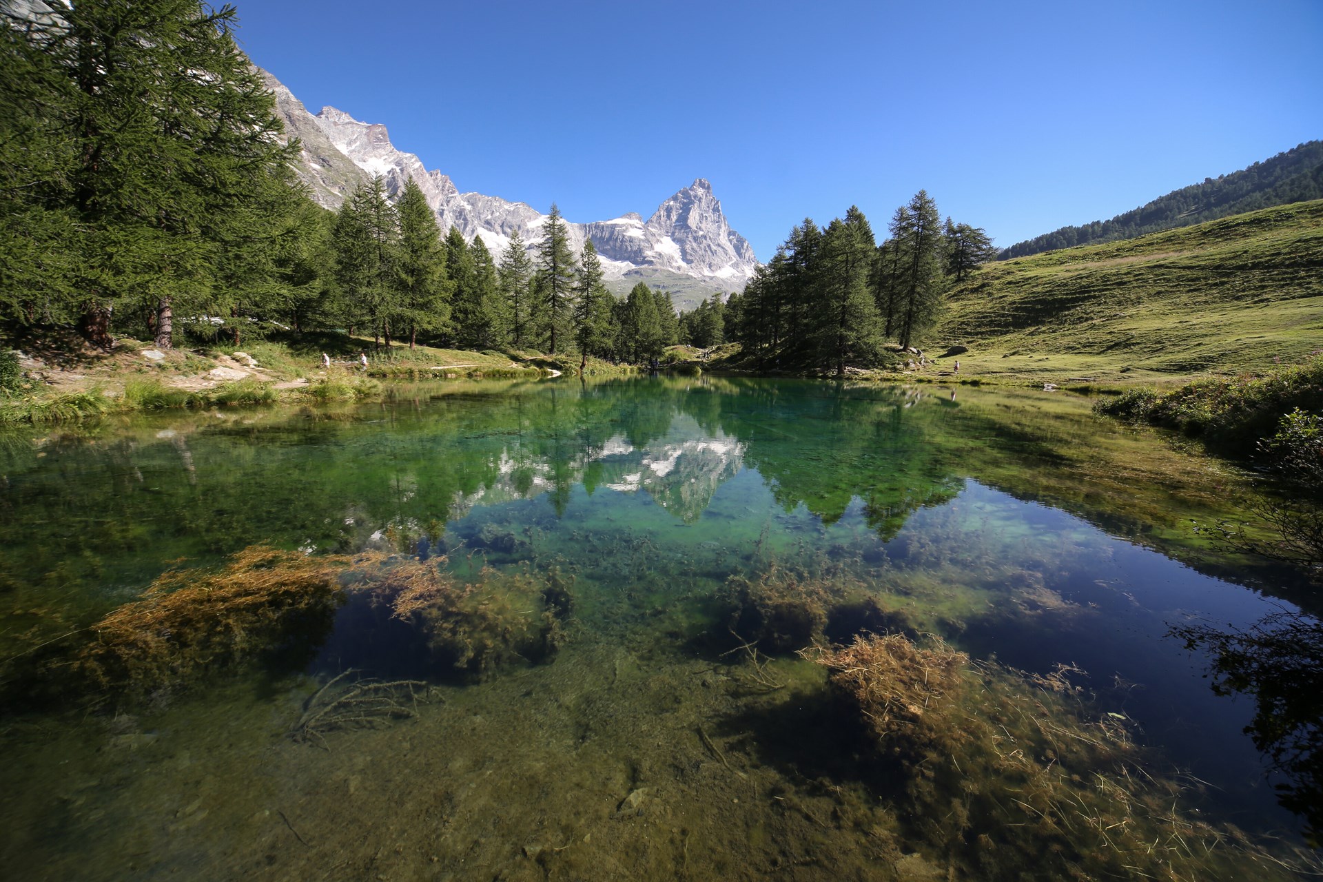 Es ist ein kleiner, von hundertjährigen Lärchen umringter See, der von frischem Quellwasser gespeist wird und deshalb einen derart klaren Wasserspiegel hat, dass sich das Matterhorn perfekt darin spiegelt.