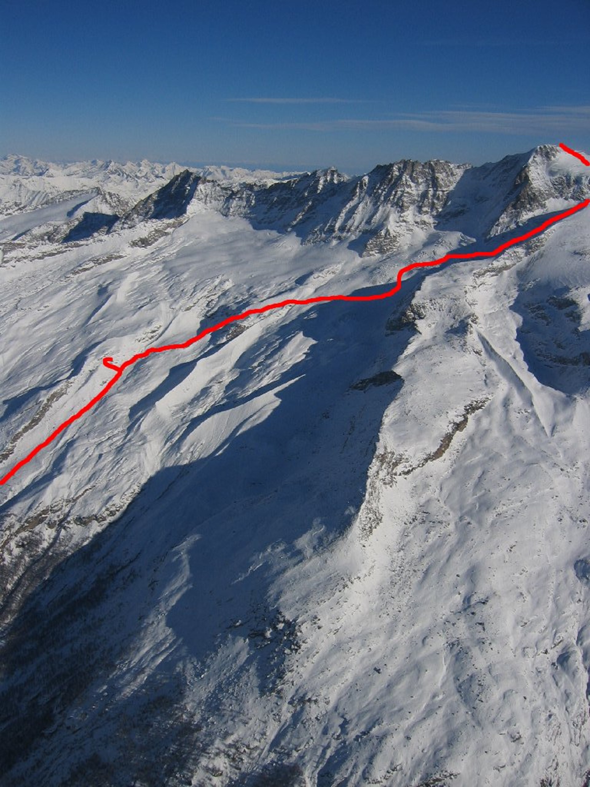 Von der Berghütte aus geht es talabwärts und dann erneut bergan, bis man eine etwas höher liegende Moräne erreicht, die man verfolgt, um rechts zum Gletscher zu kommen. Auf einem “S”-förmigen Pfad folgt man den Vertiefungen des Gletschers, um Gletscherspalten zu vermeiden. Auf einer oberhalb liegenden Hochebene, die sich auf einer Höhe von zirka 3250 m erstreckt, geht es rechts weiter zum Gletscher. Von hier aus kommt man in das gut sichtbare Tal, das sich bis zur Becca di Moncorvé hin ausdehnt. Die Route verläuft links unterhalb des felsigen Bergkamms und gelangt schließlich zu dem gut sichtbaren kleinen Hügel. Nach Abstreifen der Skier setzt man seinen Weg entlang des Gebirgsgrates bis zum Gipfel fort. Die letzten 10 m des Gebirgsgrates sind extrem ungeschützt.