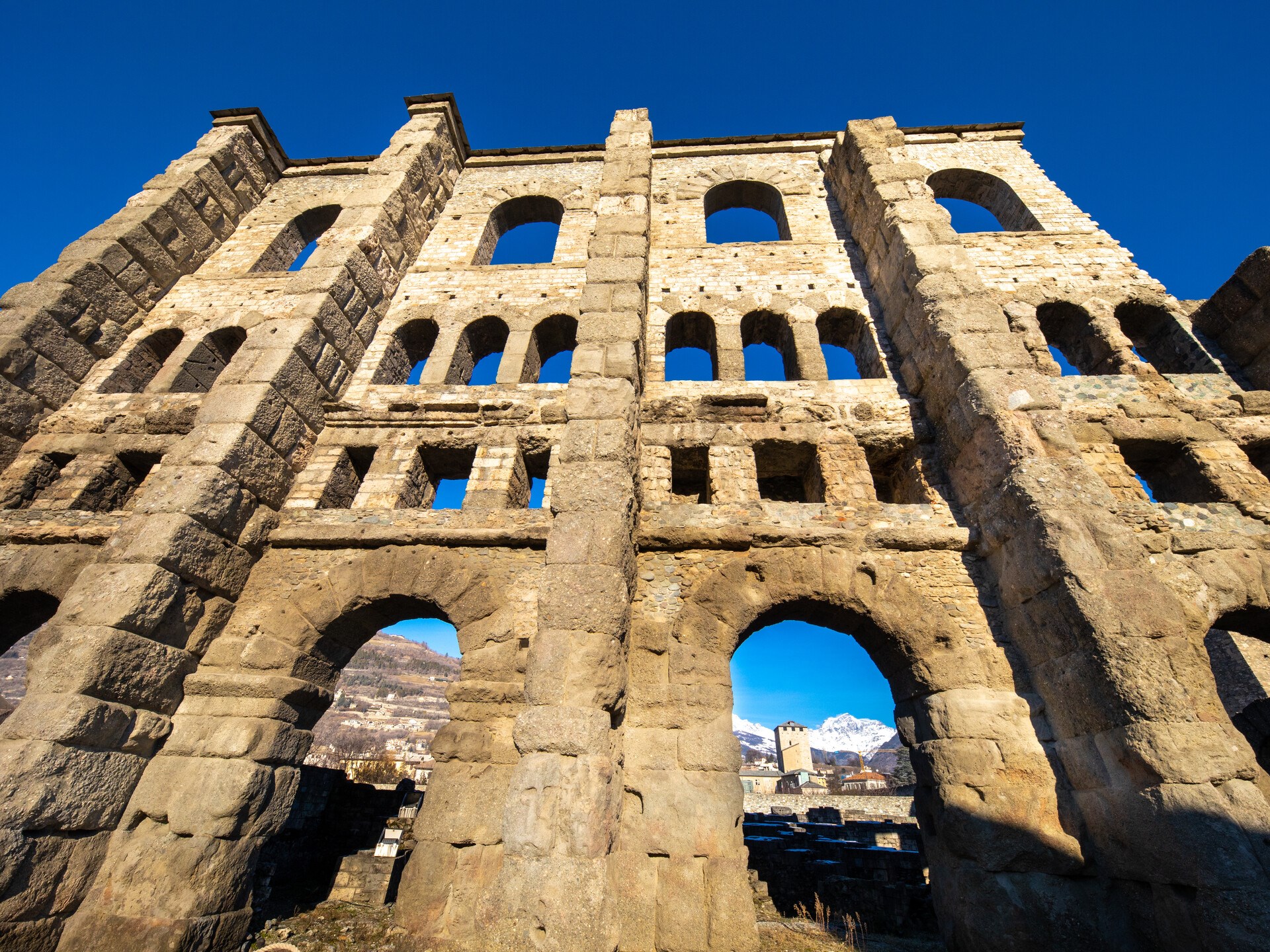 Das erste Aufeinandertreffen mit der Kolonie, die nach langwierigen und grausamen Kämpfen mit dem hier ansässigen Stamm der Salasser 25 v. Chr. von Kaiser Augustus gegründet wurde, findet an der mächtigen Römerbrücke, die über dem alten Flussbett des Buthier errichtet worden war. Auf diesem Weg gelangt man zu jenem Platz, auf dem sich der Augustusbogen erhebt. Er wurde auf Wunsch des Gründervaters der Augusta Praetoria errichtet, um den endgültigen Sieg über die Salasser deutlich zu machen und die Geburt einer neuen Kolonie zu feiern, die als Reichsbastion jenseits der Alpen dienen sollte.
