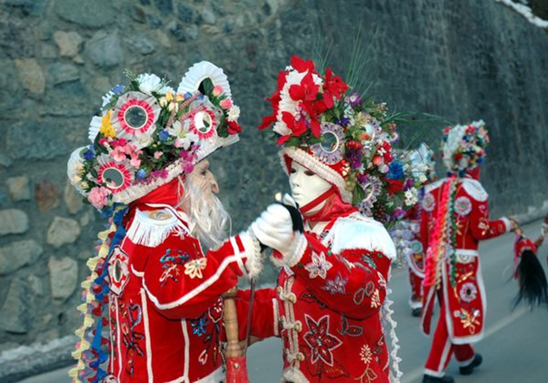 A bear is also represented and symbolises the arrival of Spring; mule tails represent the winds and are used to banish baleful breezes; the mirrors on the costumes ward off evil spirits and the bright red colour, which symbolises vigour and strength, also has the power to dispel dark spirits, ill omens and misfortune. During the parade, the carnival characters enter the homes of local families; they dance along the streets and in the squares and eat and drink whatever they are given.