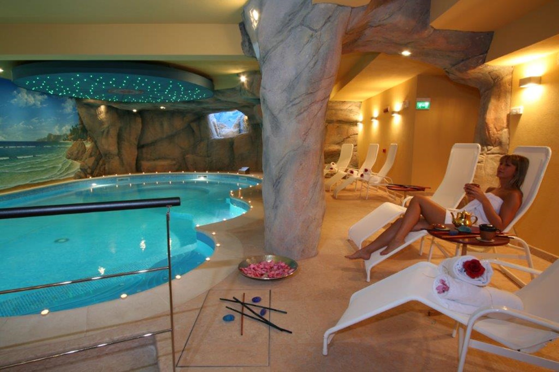 Wellness circuit with a 6×12 metre heated swimming pool equipped with 10 hydromassage nozzles and waterfalls, roman and finnish sauna, Turkish Bath, sensory showers, chromotherapy grottos, salt wall, massages and aesthetic treatments.