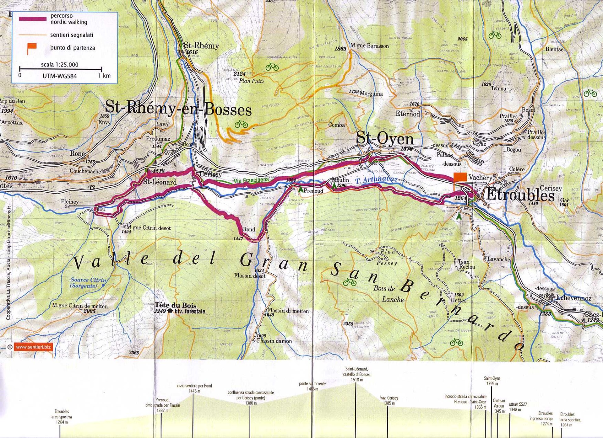 It then moves to the left orographic side to climb to the locality of Saint-Léonard and then descend along the Via Francigena itinerary to Saint-Oyen and finally return to the starting point in Etroubles.