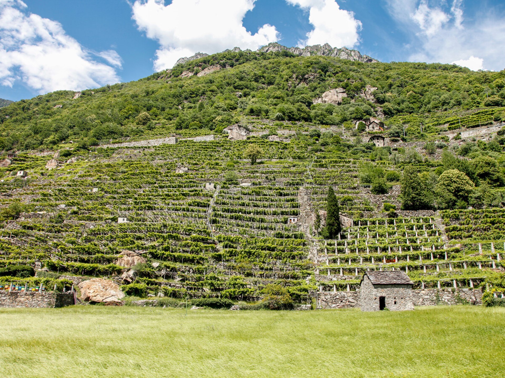 The mountainside is crossed by an evocative road that runs through the vineyards to the town of Donnas. During the route you can see the topie (pergolas) that support the vines and the barmets (cellars carved under a large boulder).