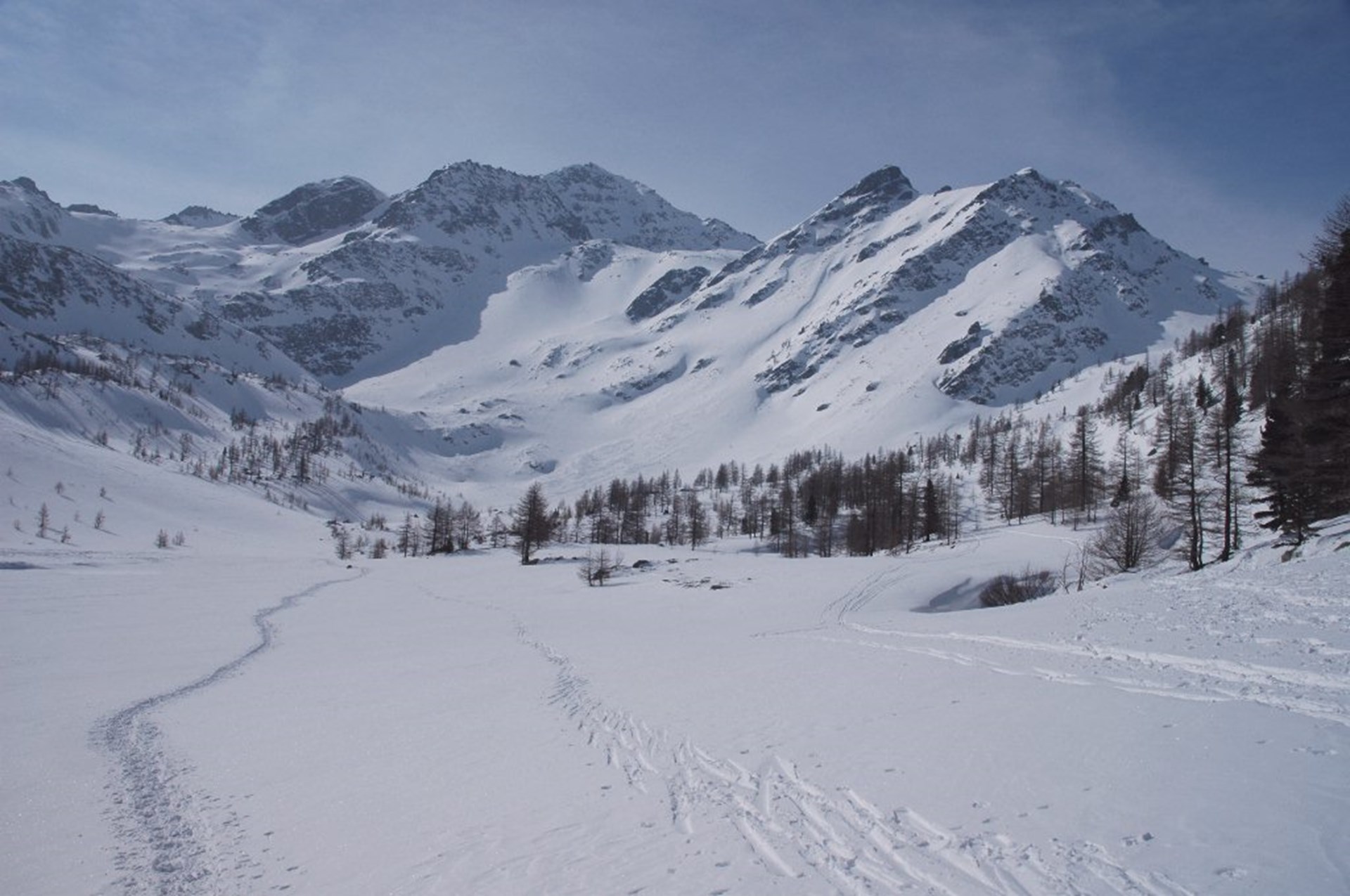 Continue around the snow-covered lake on the right, starting to climb through the sparse larch wood. Follow any marking you find to the first rather steep peak. This leads to a delightful plain where you can see your final destination. Cross it, switching-back to take in all the pleasures of this winter hike, until you reach the last peak before the hill. Climb the bends in the ridge to the fortifications, usually covered in snow: a last push and you’re finally at the Col de la Croix.