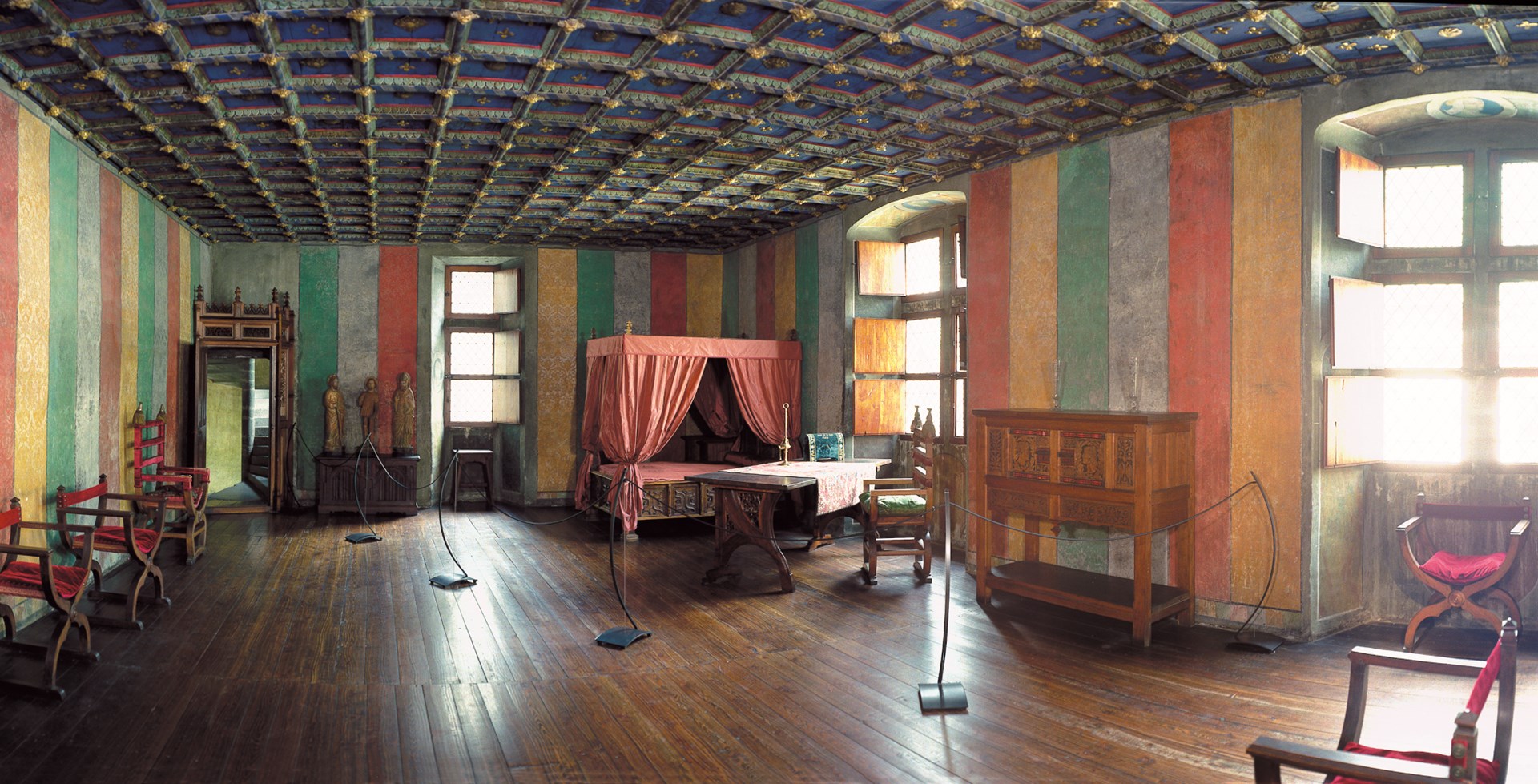 - on the second floor, the “King of France’s room”, with a coffered ceiling decorated with lilies and a fireplace with the French Vallois dynasty shield, and the room called the “Knights of St. Maurice” with a beautiful, coffered ceiling with the Order’s cross painted on it.