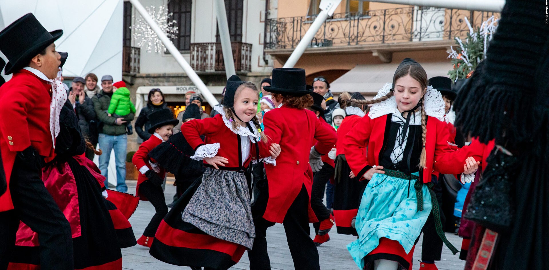 El rojo y el negro, colores de la bandera de la región del Valle de Aosta, también distinguen el traje típico de Courmayeur.