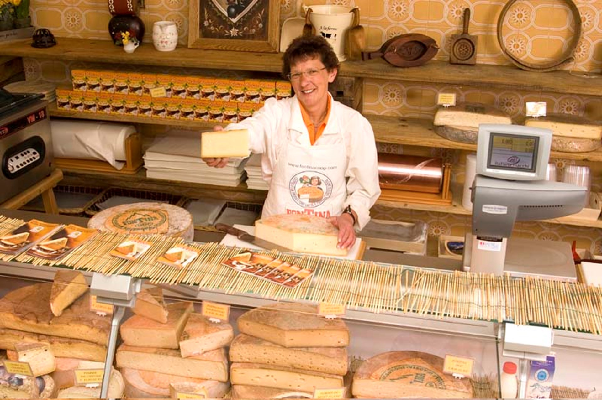 Venta al por menor de mantequilla, yogur, Fontina, quesos de cabra, además de productos de charcutería y vinos del Valle de Aosta.
