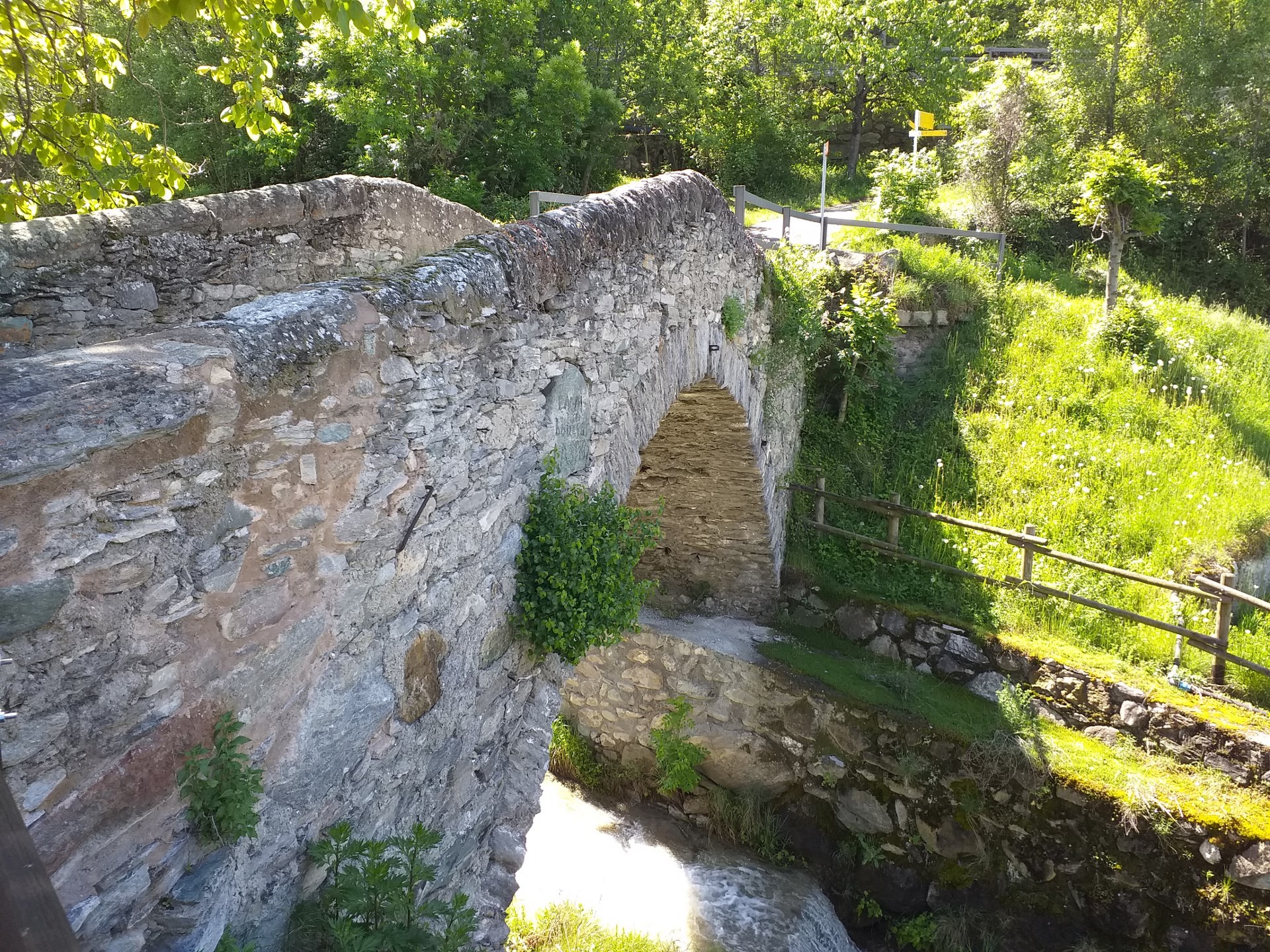 Cruzaremos la SR 40 en una curva, el sendero se estrecha y tiende a subir ligeramente. Llegaremos a un cartel que indica el ru d’Arberioz y desde aquí comienza el camino agrícola que desciende con la posibilidad de llegar al pueblo de Pompiod y volver a Gressan en autobús.