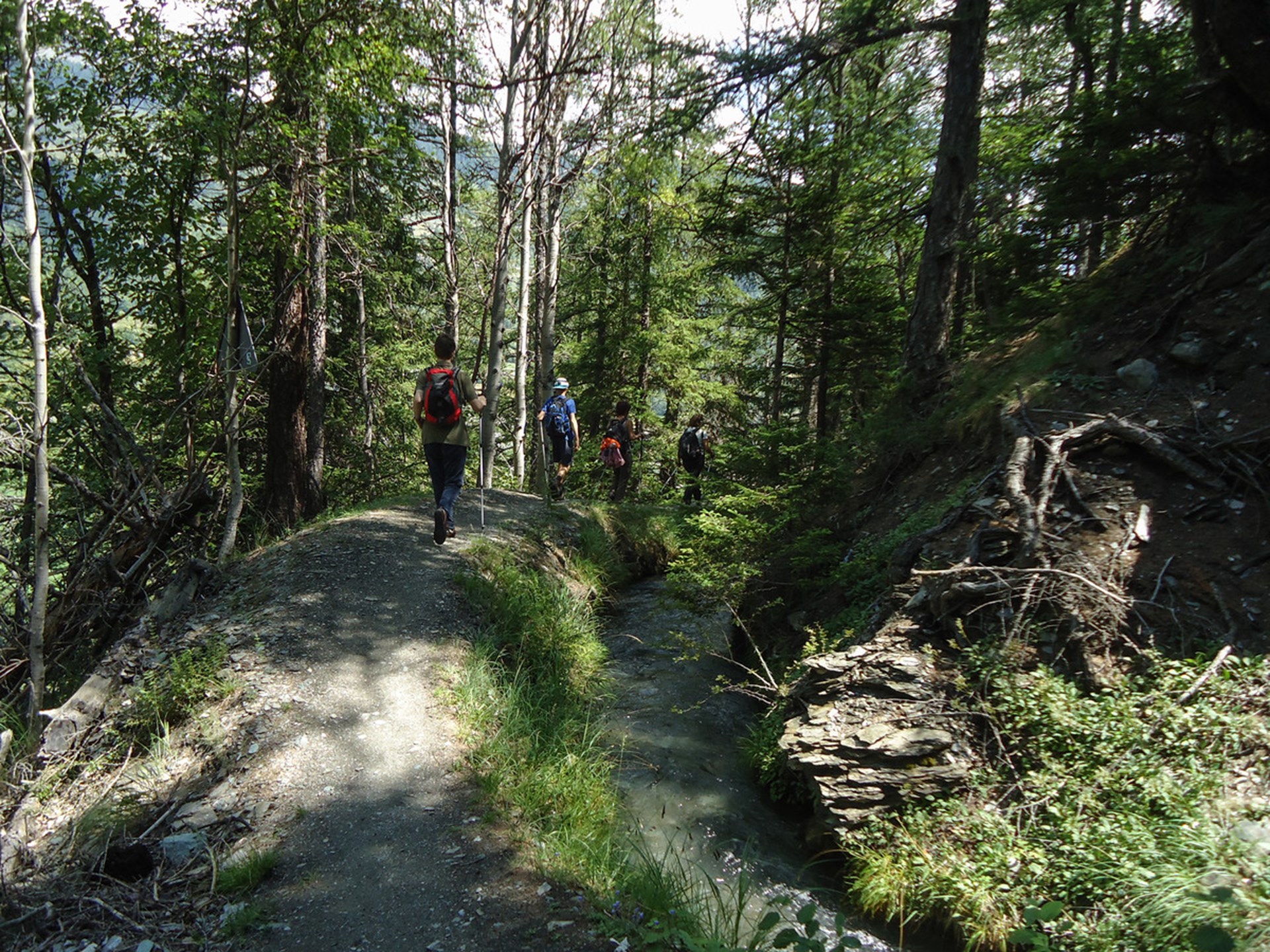El sendero continúa por el ru Neuf, el canal de riego que lleva agua del río Artanavaz para transportarla a la soleada colina de Aosta. El sendero lo bordea y serpentea, casi plano, pasando por densos bosques poblados por ciervos y venados y claros encantadores donde la vista puede fijar a las montañas de Valpelline.