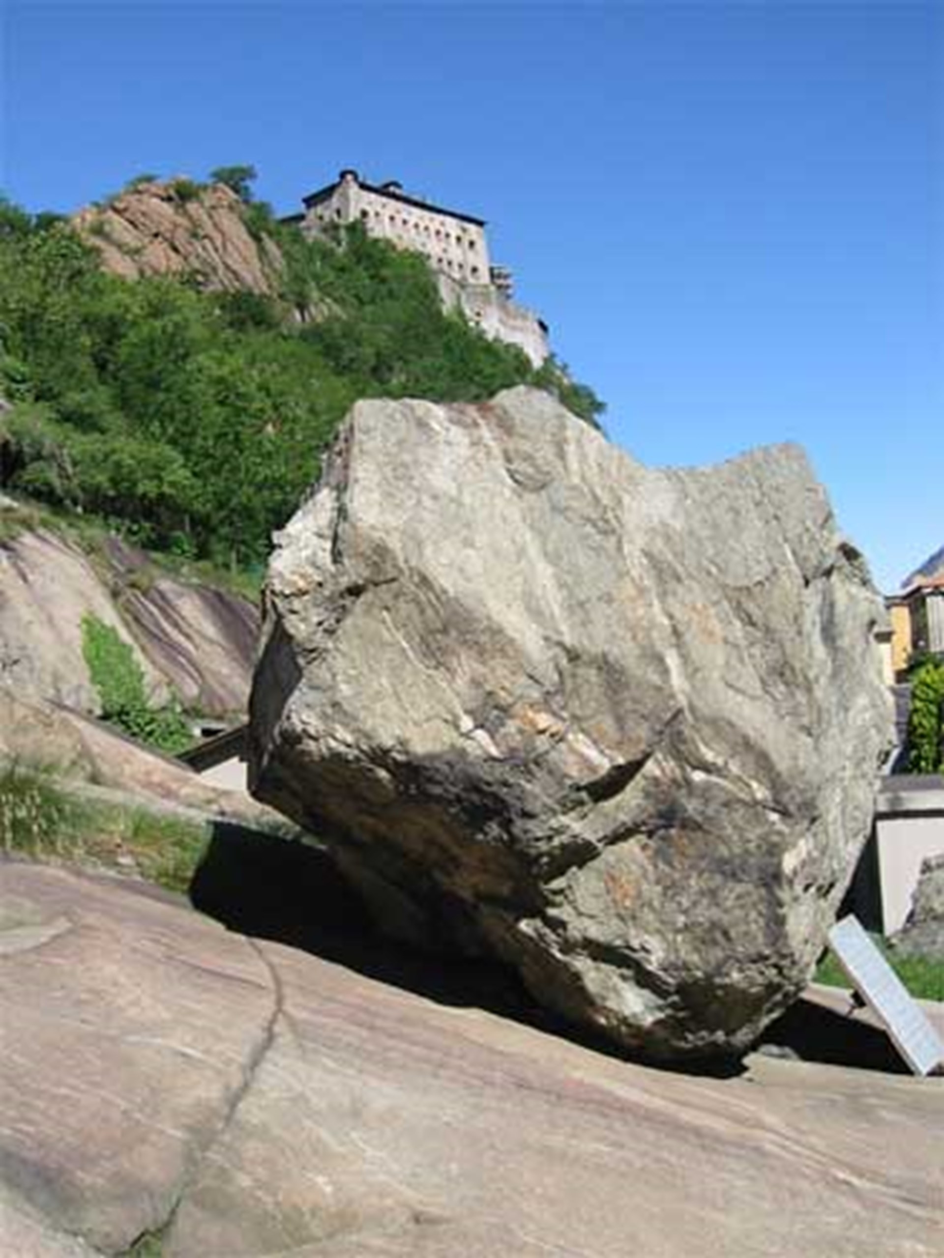 L’éboulement historique de Bard fait partie de la typologie des effondrements de masse dont le volume estimé est de 160 000 m3. Il est constitué de gros blocs rocheux de gneiss, de forme cubique et prismatique. Cet évènement est le témoignage le plus récent de nombreux éboulements qui ne se seraient pas limités au site balisé.