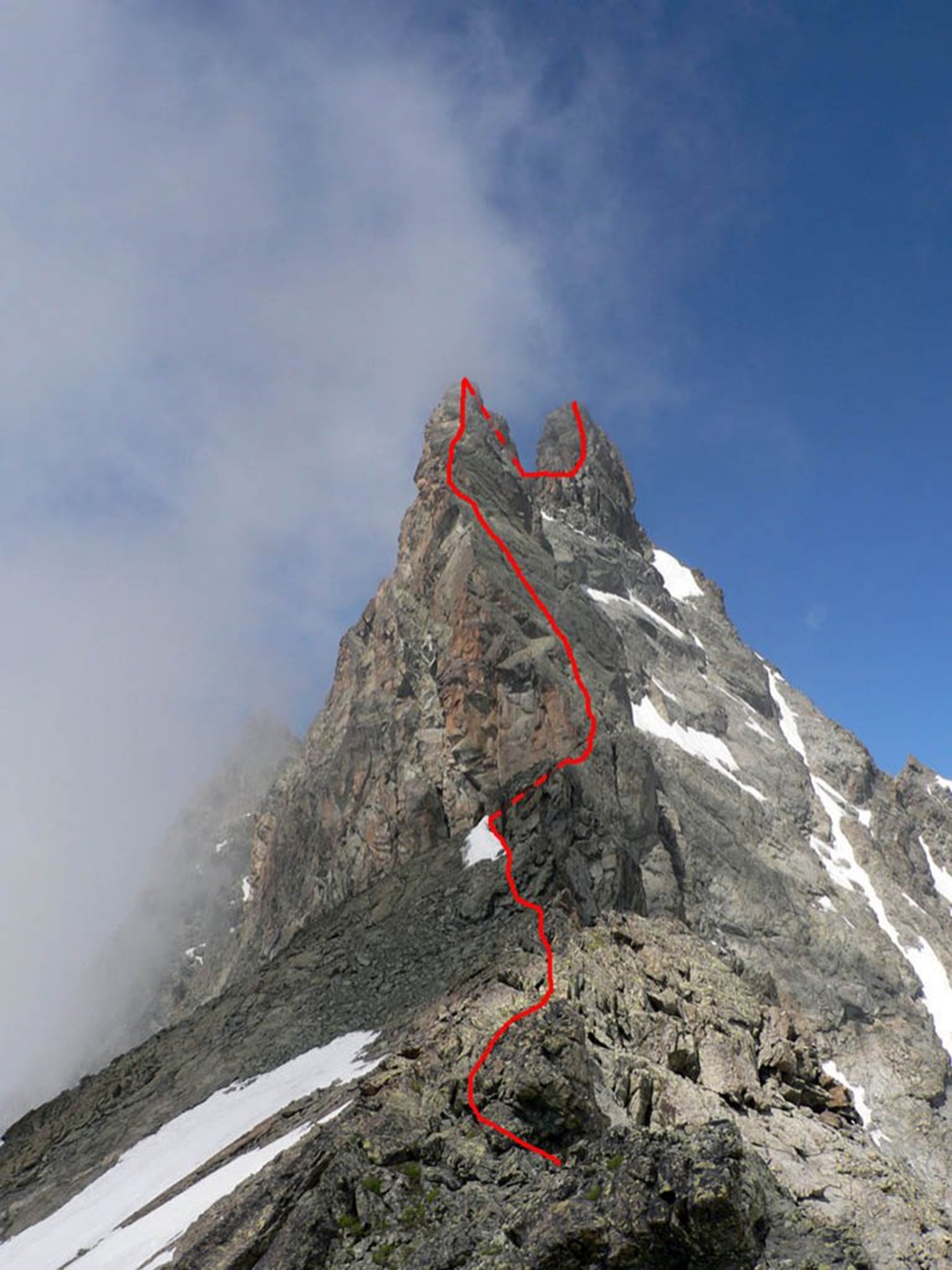 Du campement, rejoignez le Col de Fort (2906 mètres d’altitude) ; la crête de la Punta Tsan se trouve à sa gauche. Après quelques pas, vous verrez une plaque facile à franchir avant de continuer sans difficulté jusqu’au bout du premier ressaut. Le tronçon suivant conduit au plat au pied de la seconde risberme que vous aborderez par la gauche en montant sur une plaque inclinée vers la droite qui vous amène à la ligne de crête. Tournez ensuite vers la droite et rejoignez le versant nord dominé par de belles plaques compactes. Franchissez-les à l’aide de deux longueurs de corde vers la gauche jusqu’à la base de la cheminée de Maquignaz. C’est le passage obligé pour atteindre le sommet du second ressaut. Un nouveau tronçon au plat conduit à la base du troisième ressaut : remontez-le en longeant un imposant dièdre qui s’arrête à quelques mètres du sommet.