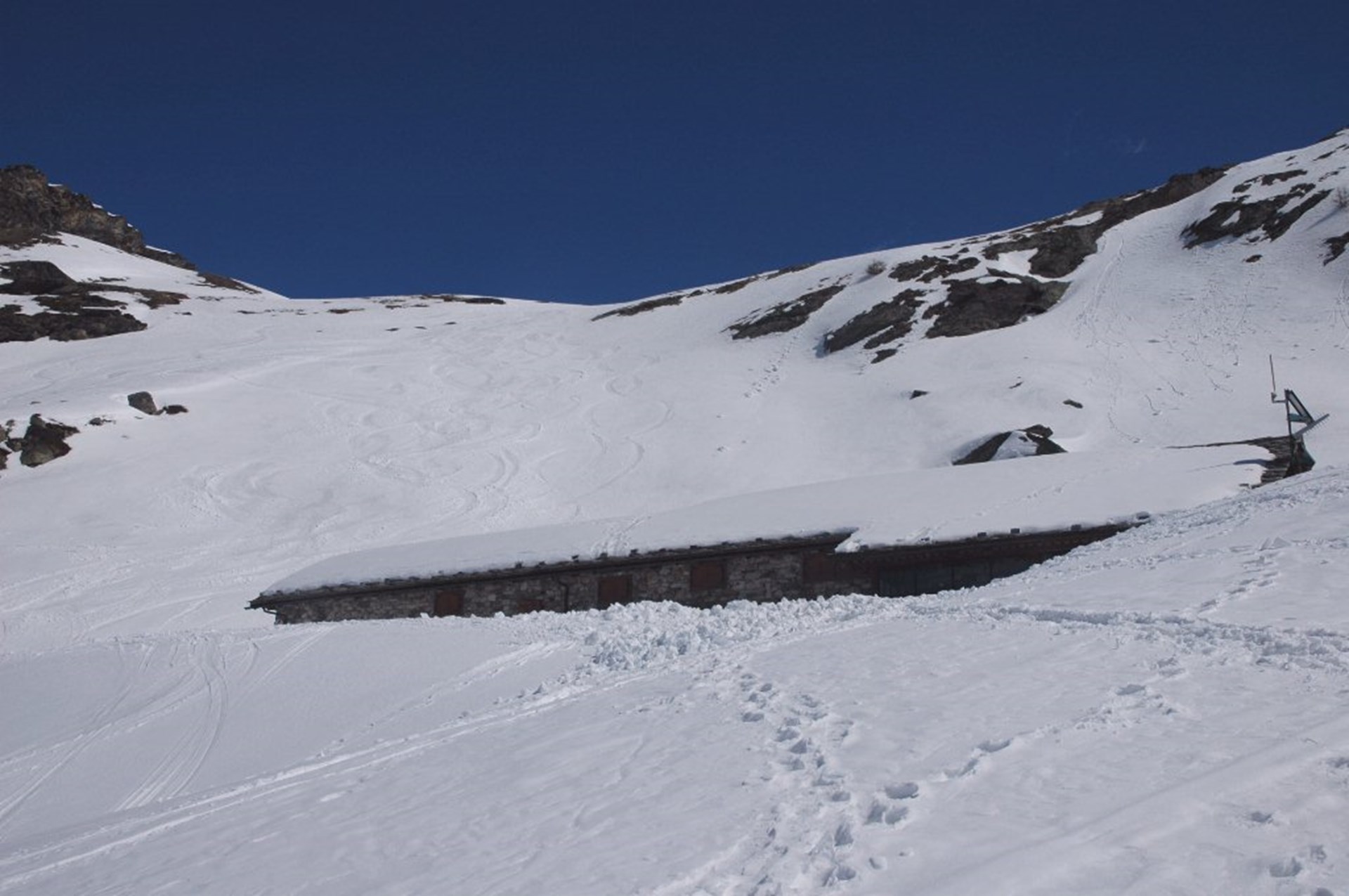 Tournez à gauche et commencez à remonter une piste enneigée souvent damée par les skieurs alpinistes au retour. Après quatre lacets, vous arriverez à un croisement : tournez à droite en suivant les indications pour Plontaz et Quattro Denti. Pénétrez dans le bois essentiellement peuplé de mélèzes en suivant une longue ligne droite ; après avoir dépassé un dépôt d’avalanche, vous rejoindrez la splendide clairière située au-dessous des alpages abandonnés de Bouque que vous rejoindrez après avoir marqué un grand virage à gauche. Après Bouque, entrez dans le bois et remontez en lacet sur la hauteur jusqu’au croisement indiquant le refuge : suivez les indications pour l’Epée en ignorant la petite route que vous avez suivie jusqu’alors.