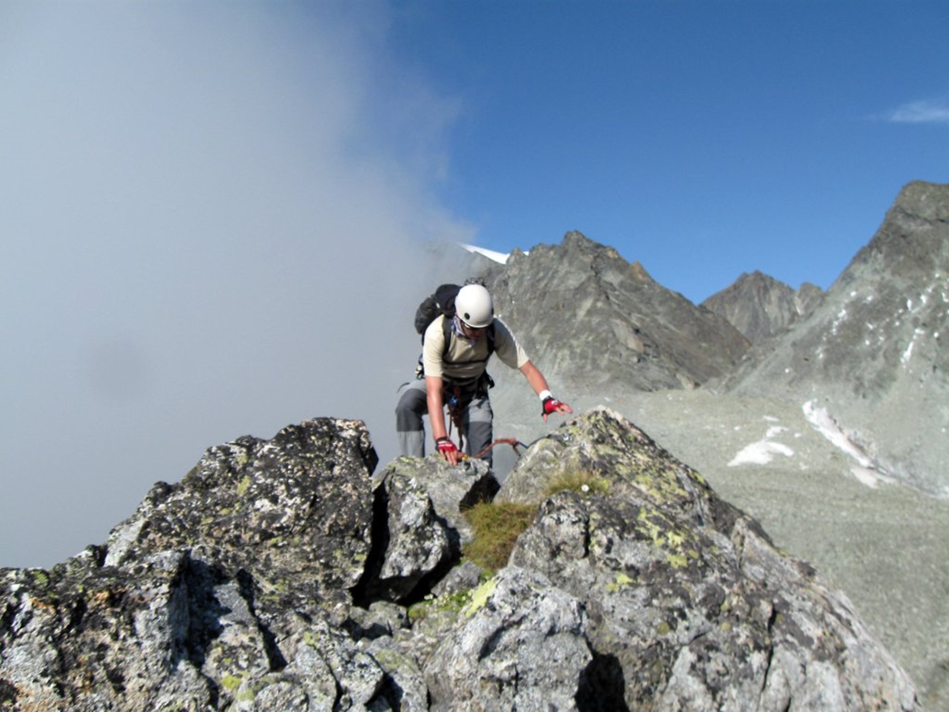 Continuez sur la droite en cherchant plusieurs cairns peu visibles, mais en vous dirigeant facilement vers l’immense cairn présent sur le col et que l’on distingue facilement depuis le bas. Au niveau du col, continuez vers la gauche sur le parcours aménagé qui remonte toute la crête. L’itinéraire est continu et simple. Il comporte quelques tronçons aériens assez courts qui ne sont pas équipés de câbles car cela est inutile. De courtes plaques amusantes sont présentes sur la dernière partie à gauche de la crête. La roche s’effrite un peu par moment, mais cela n’est pas gênant.
