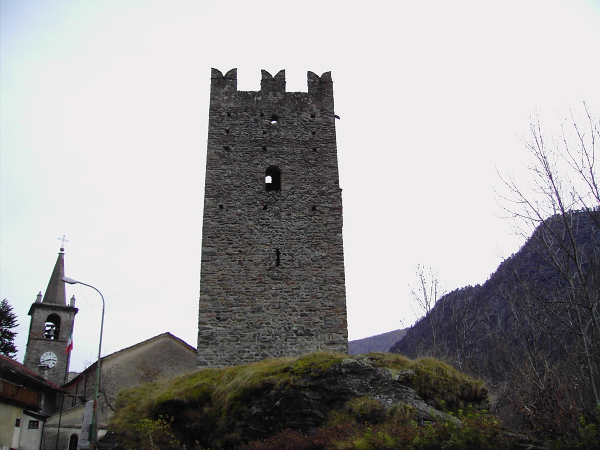 De l’ancienne construction, on peut encore voir la tour à plan carré (un peu plus de six mètres de côté) avec des crenaux à queue d’hirondelle, au sud ouest de l’église. Servant de tour de signalisation au Moyen Âge, on y accède par une porte accessible par un échelle située quatre mètres au-dessus du sol.