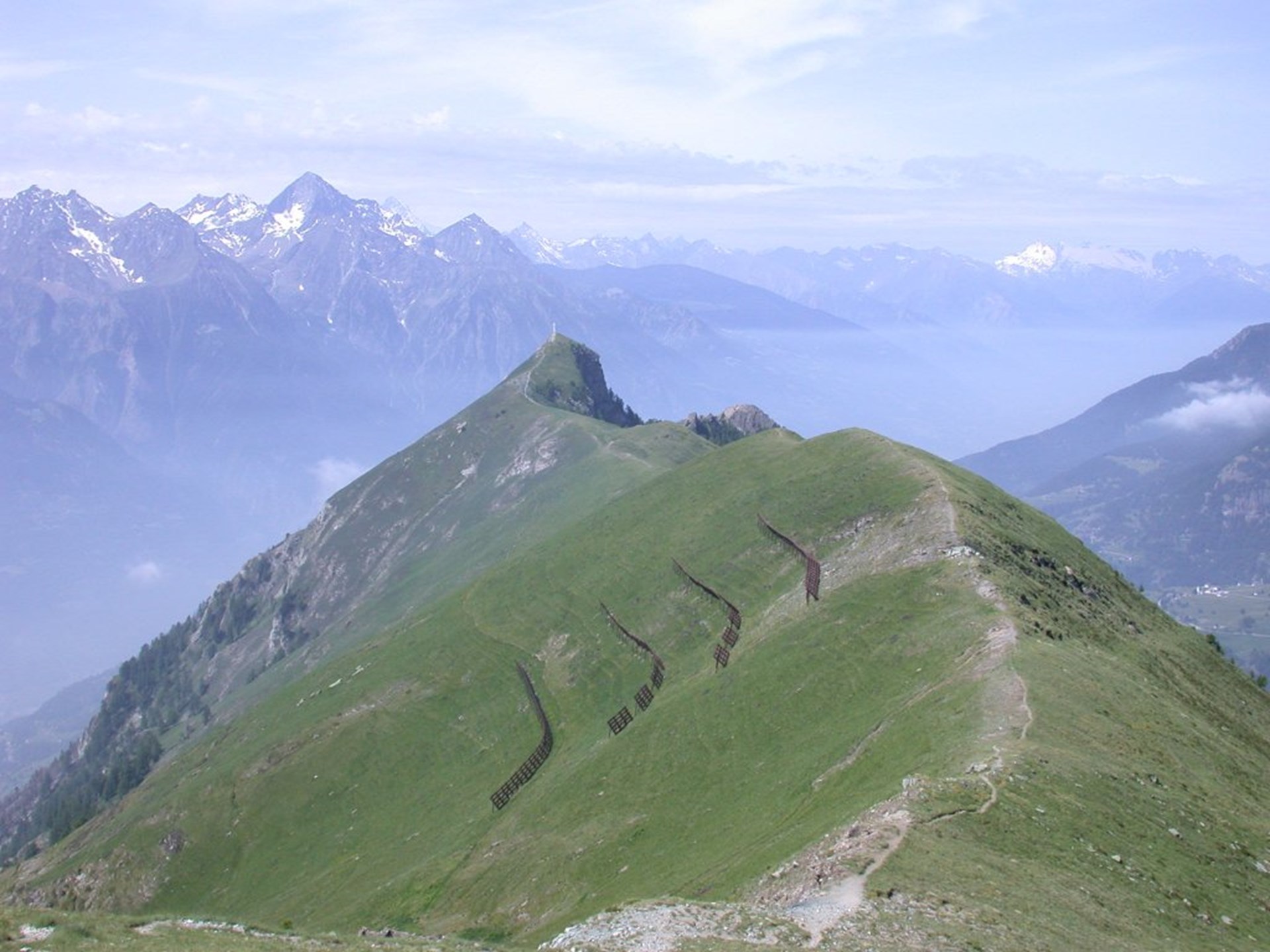mboccare la strada sterrata, che con un ampio tornante verso destra supera l’alpe di Ronc e sale gradatamente al Col des Bornes. Imboccare ora sulla sinistra il sentiero n.1 che sale nel bosco, fino ad incontrare in una radura pianeggiante l’itinerario proveniente da Grand Villa, n.2. Sempre sullo stesso itinerario, proseguire salendo nel bosco, che diventa più rado e lascia spazio ad ampie praterie alpine, e raggiungere il Col d’Aver dove perviene il sentiero n. 11 da Torgnon. Piegare a sinistra e raggiunta l’Alpe Aver, salire alla piccola Cappella e in poco tempo alla Cresta erbosa, spartiacque tra Verrayes e Nus. Proseguendo sulla destra, sul sentiero n. 16, si guadagna in poco tempo La vetta, indicata con una piccola croce di ferro. La vista si apre sulla Valtournenche e sulla valle di Saint-Barthélemy.