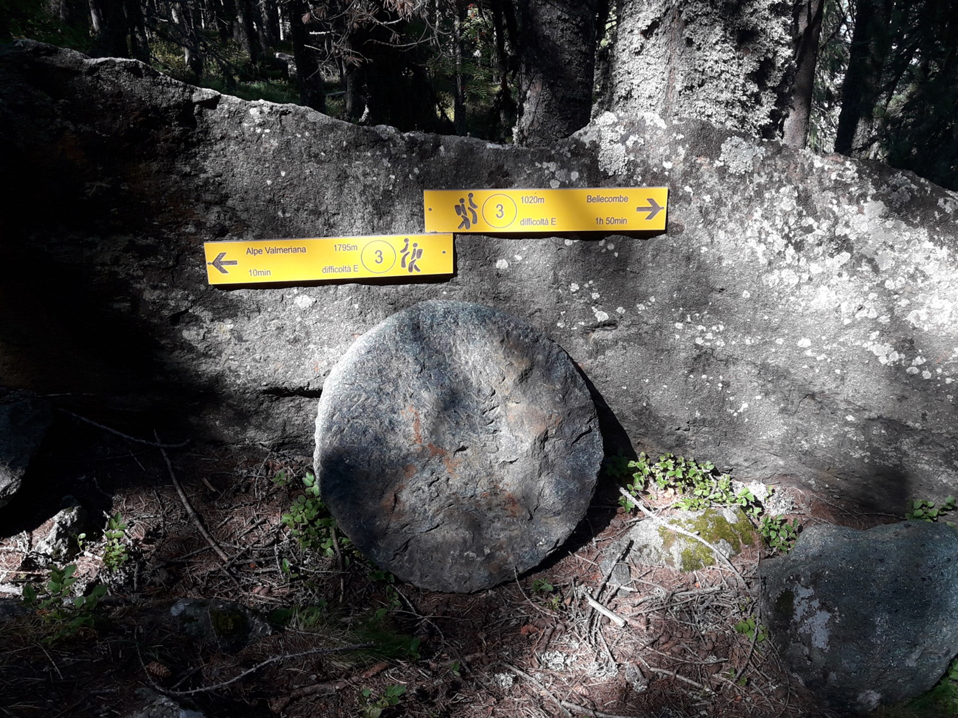 Ci si avvia lungo il sentiero per Bellecombe, segnavia 3. Dopo una breve salita si vede pochi metri sotto il sentiero la prima macina ancora attaccata al masso, con un diametro di circa 60 centimetri e uno spessore di 20. Ai suoi piedi un altro frammento di macina; una ventina di passi più avanti ecco scorgere il sasso del divano dal quale sono state estratte quattro macine, il cui nome è dovuto agli incavi lasciati togliendo le macine, che ricordano i cuscini di un sofà. Continuando se ne scorge una con foro centrale staccata ma non finita, ricchissima di cristalli rossi. Da segnalare che alcune giacciono abbandonate nel bosco, a fianco del sentiero. Si prosegue il percorso, fino a rientrare sul sentiero per Bellecombe e, seguendo una traccia che sale sulla destra, si arriva alla grotta delle tre bocche, cavità in parte naturale usata per l’estrazione delle macine. Degno di nota anche un grosso masso ribattezzato il planetario dal quale sono state probabilmente estratte alcune decine di macine. (testo tratto da navillod.it)