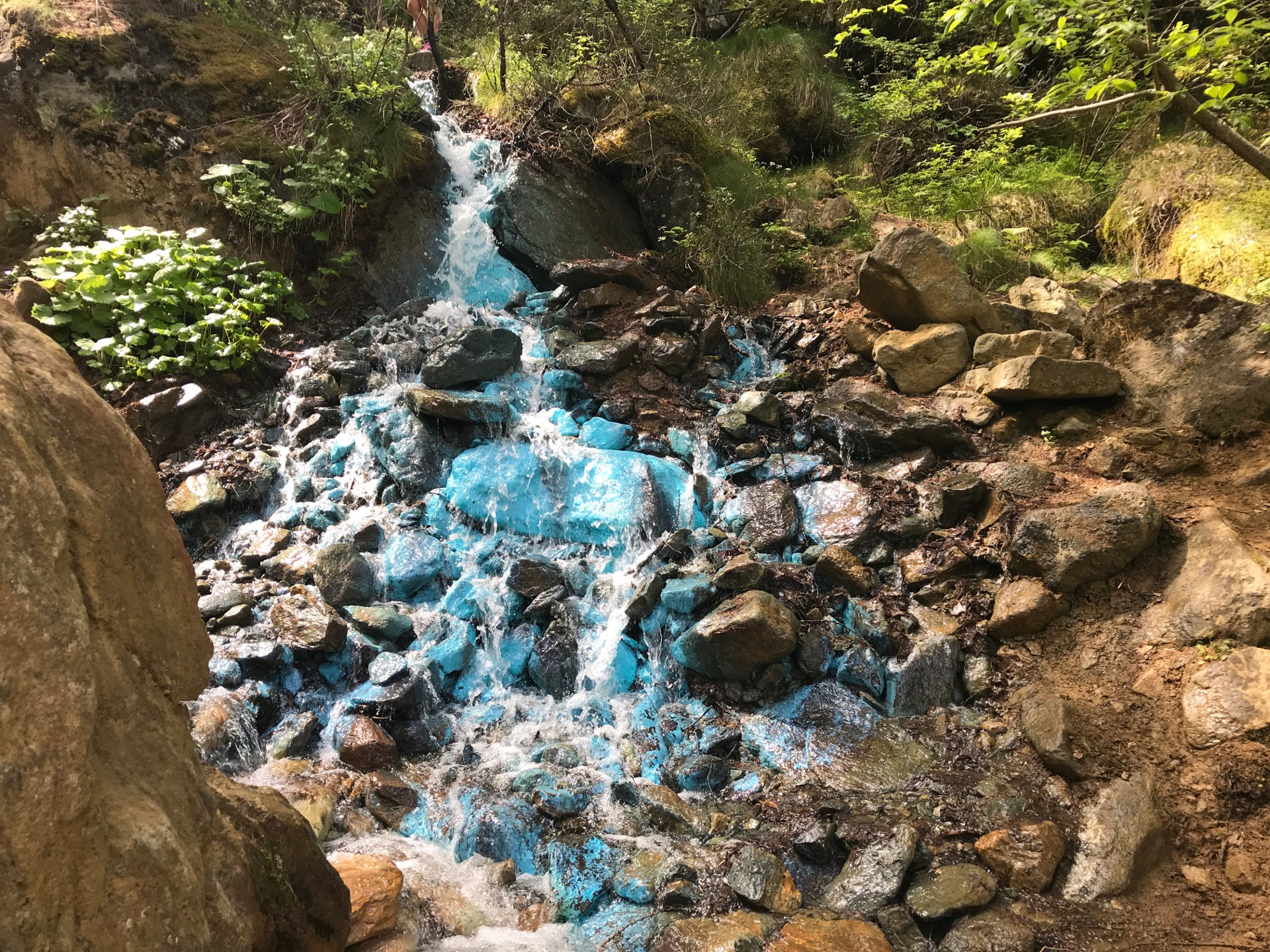 Si prosegue quindi lungo l’itinerario 4 percorrendo la strada sterrata che in alcuni punti attraversa il torrente. Lungo il percorso si notano i resti di alcuni fabbricati industriali legati all’attività mineraria. D’un tratto si arriva all’attraversamento del ruscello dell’Eve Verta. L’acqua del ruscello scende su di un letto dal colore turchese carico.