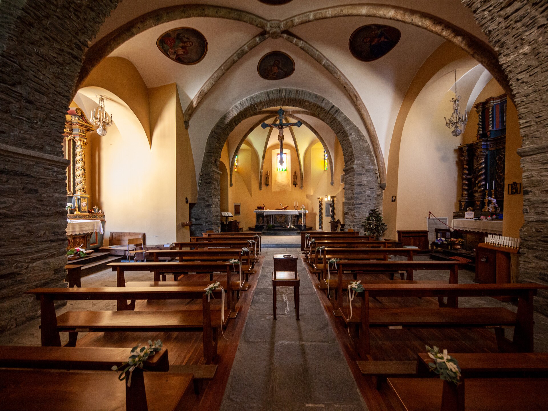Vicino all’ingresso, battistero in pietra lavorata (1688), con lo stemma dei Savoia, signori della Valdigne.