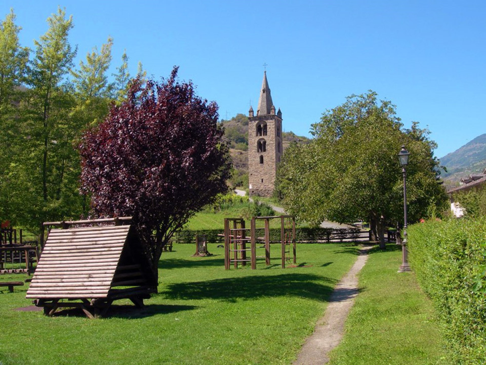 Grünfläche begehbar, Multiplay-Strukturen, Rutschen, Schaukeln, Federwippen, Karussell, Klettergerüste, Sandplatz, Bänke, Trinkbrunnen, Toiletten.