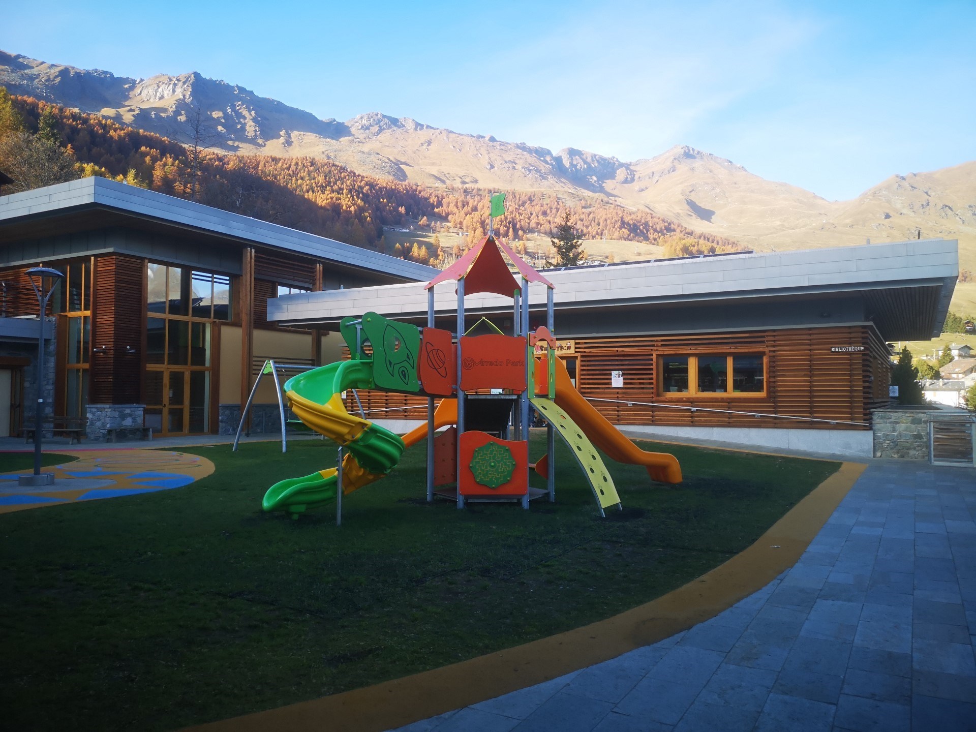 Im Park neben dem neuen Kindergarten, der Grundschule und der Stadtbücherei gibt es einen Spielplatz mit einer großen Burg mit Rutschen, einer trittfesten Grünfläche und Bänken.