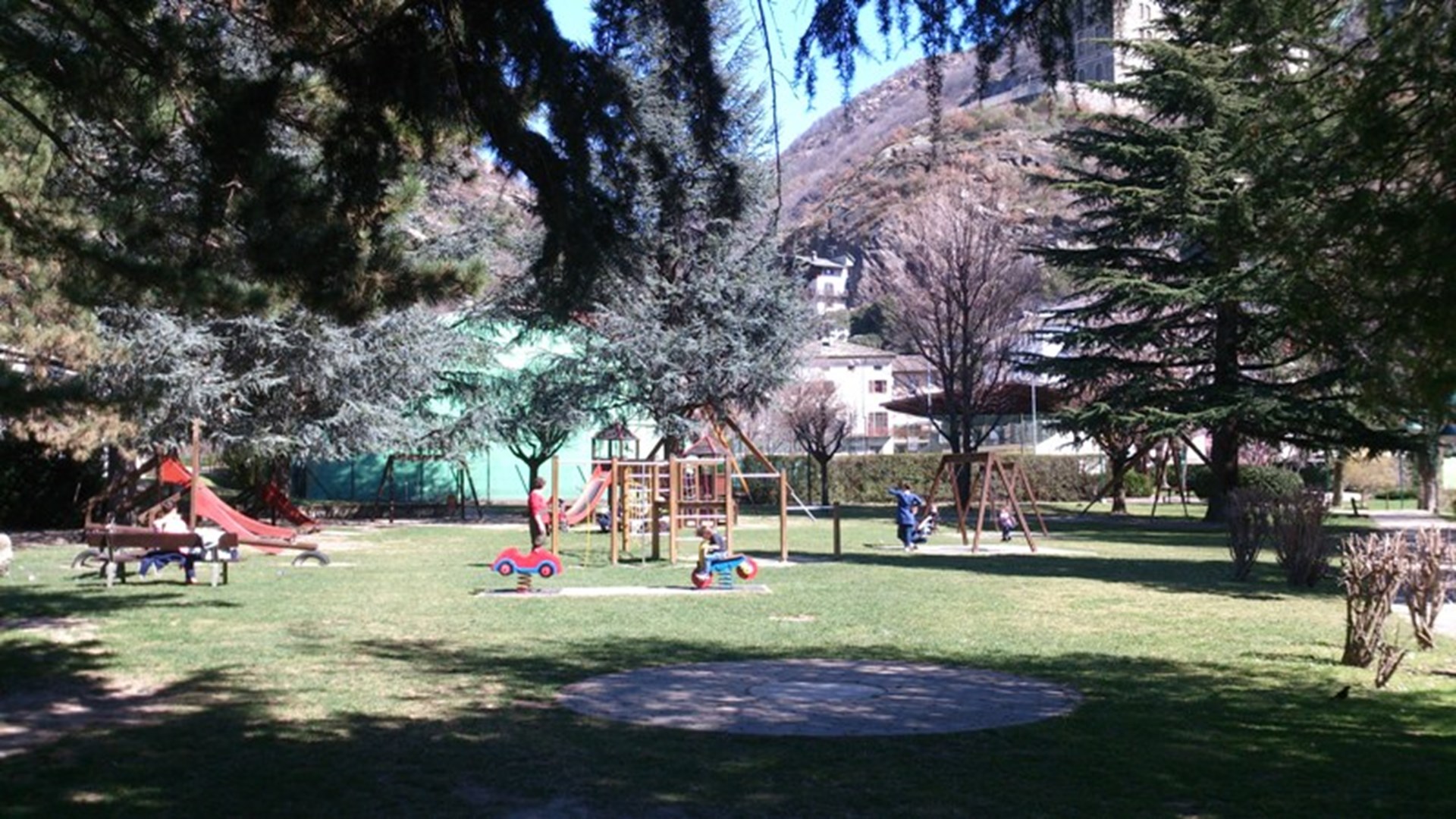 Zona verde calpestabile con n. 6 altalene, n. 2 giochi a molla, n. 4 scivoli, n. 2 strutture per arrampicarsi,n. 1 piattello scorrevole su cavo metallico (teleferica),n. 1 area per pattinaggio a rotelle,n. 1 struttura per arrampicata sportiva,n. 21 panchine.