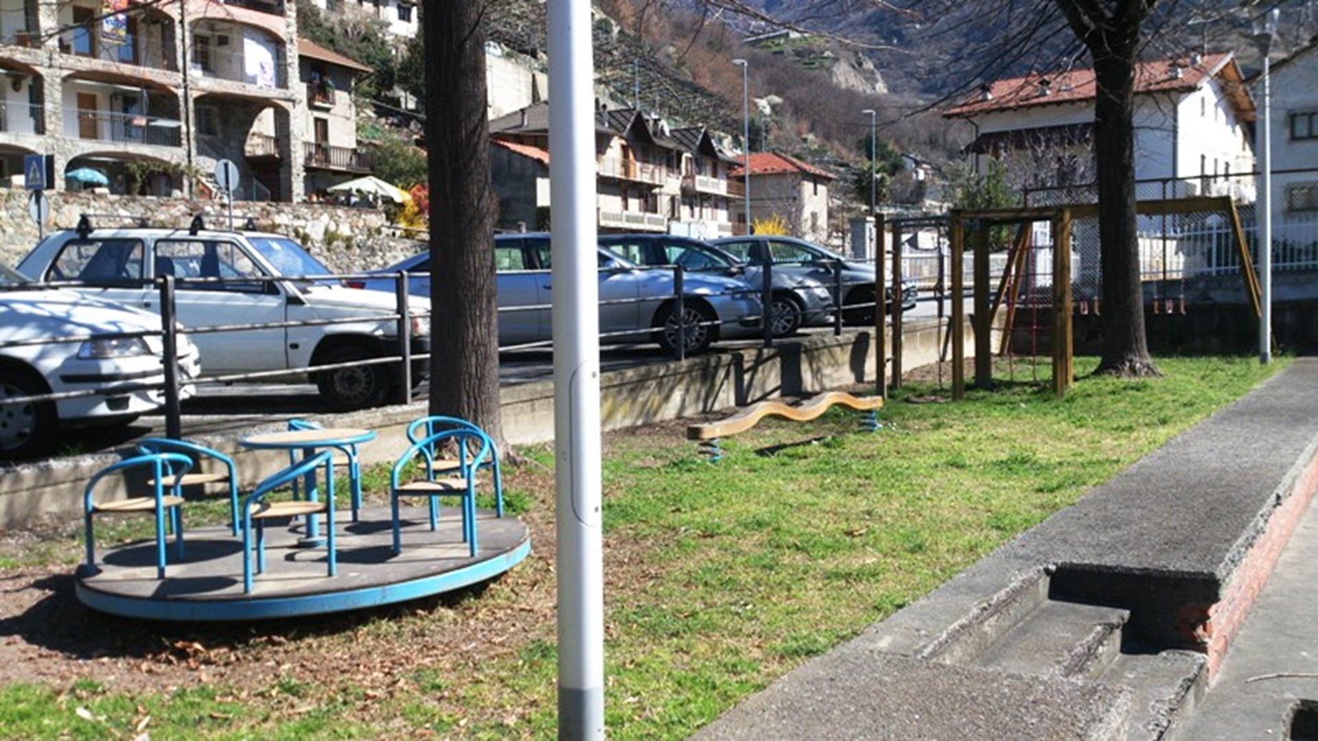 Area giochi con n. 4 altalene, n. 2 giochi a molla, n. 1 scivolo,n. 1 giostrina,n. 1 struttura per arrampicarsi,n. 1 campo da basket,n. 1 panchina.