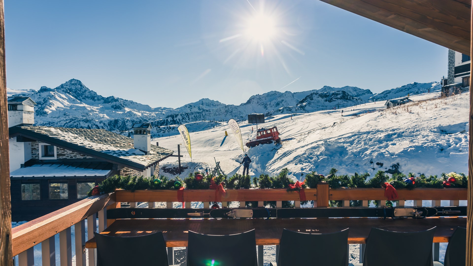 Modern and welcoming restaurant with a stunning view over the Mont-Blanc. Reachable on foot or by bike in summer, by ski or with the ski facilities in winter, it lies at the arrival of the Les Suches cable car.