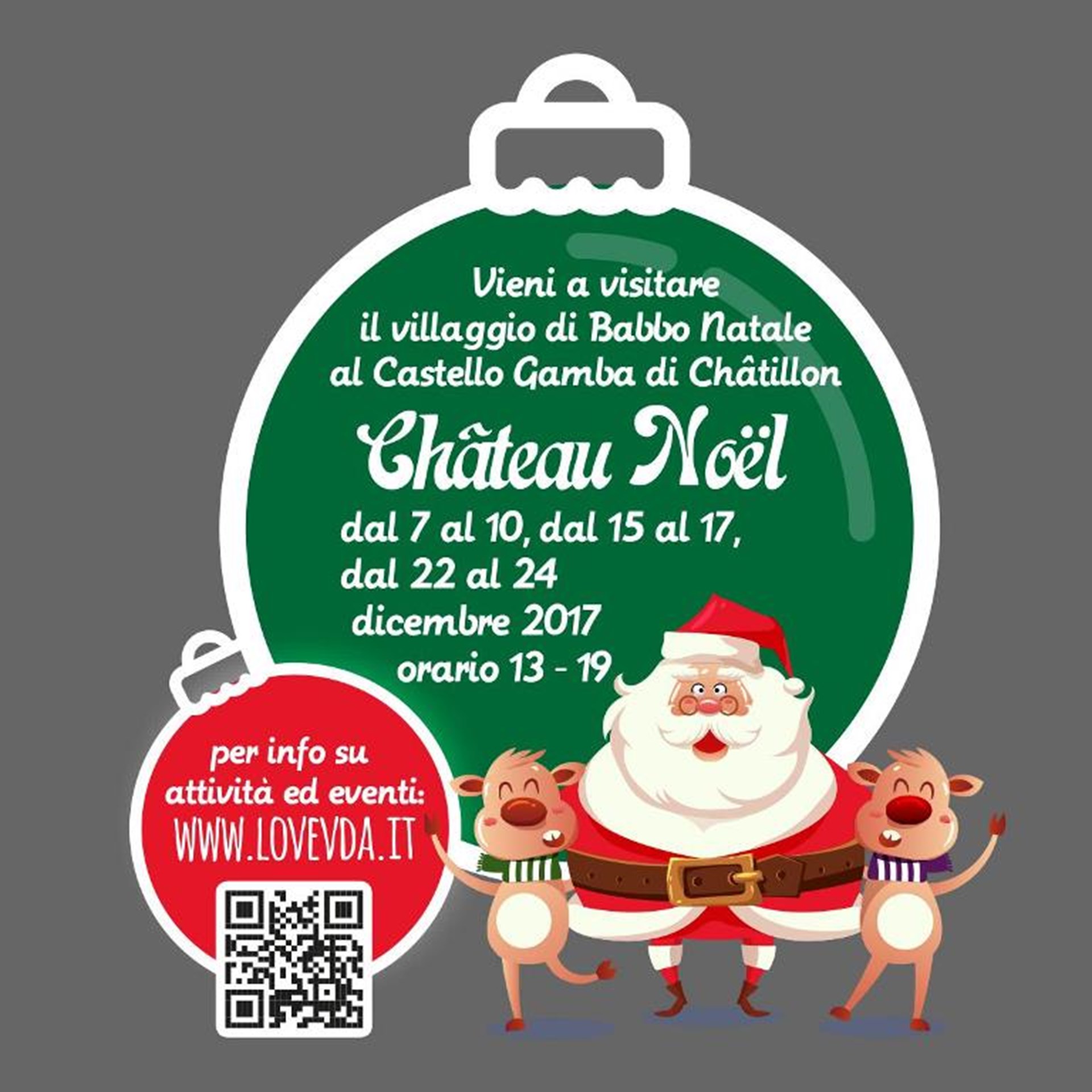 Il Castello Gamba si trasforma in un grande villaggio di Natale che ospita la casa di Babbo Natale con le renne e i suoi elfi, la giostra, spettacoli, animazioni e laboratori per bambini, golose merende, il mercatino e tanto divertimento
