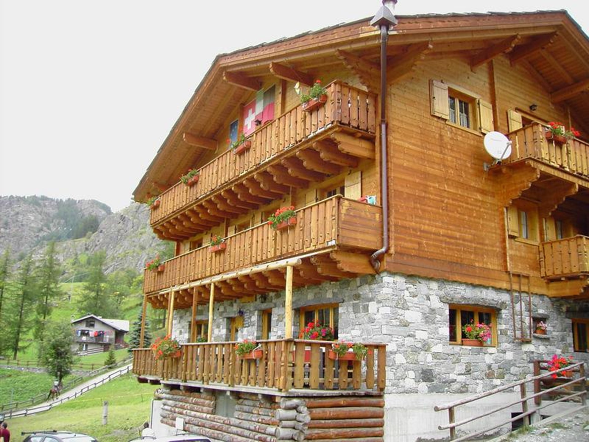 Schönes Chalet aus Holz und Stein, außerhalb der geschlossenen Ortschaft, in Panoramalage, am Fuß der Berge.