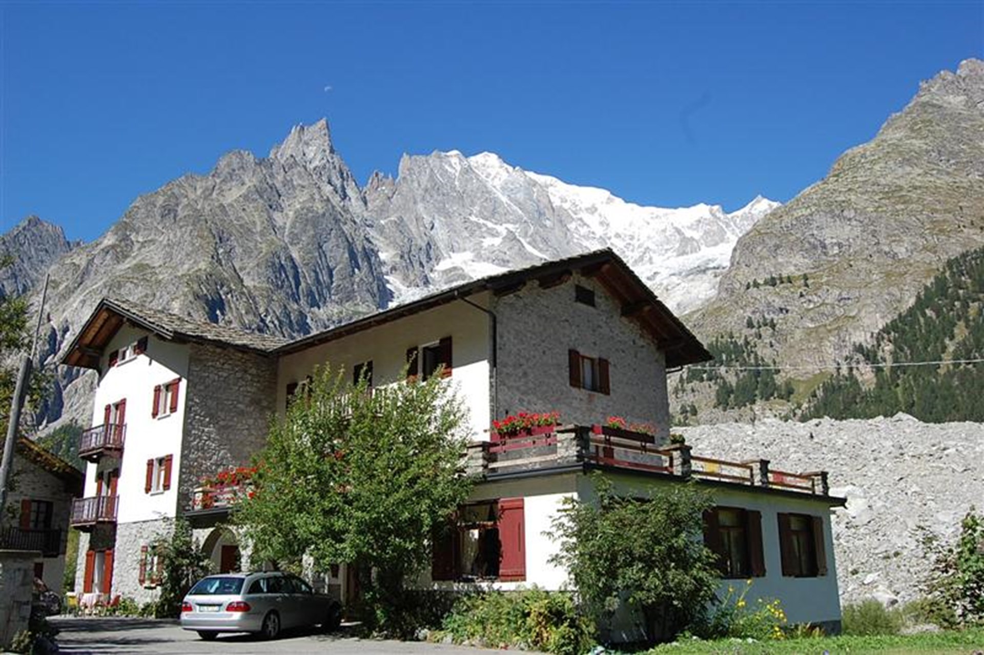 Gebäude im typischen Bergstil, eingebettet in das herrliche Panorama-Grün des Val Veny am Fuße des Mont Blanc-Massivs.