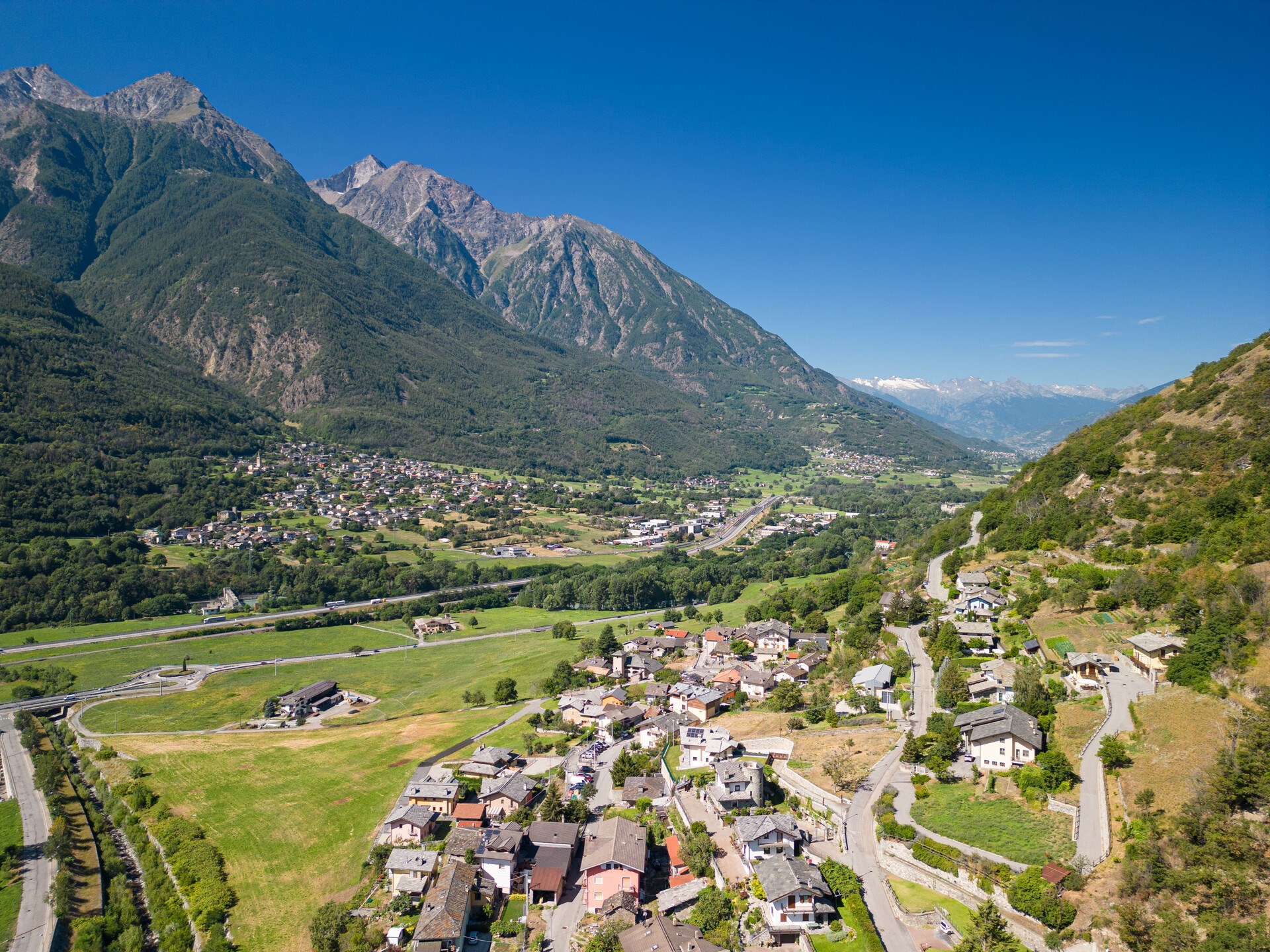 Der Ort befindet sich am linken Ufer der Dora auf einer Anhöhe in 529 Metern zwischen Kastanienhainen, Obstbäumen, Wiesen und Weinbergen, aus denen der berühmte Vien de Nus stammt. Das Dorf liegt am Eingang des Valle di Saint-Barthélemy.