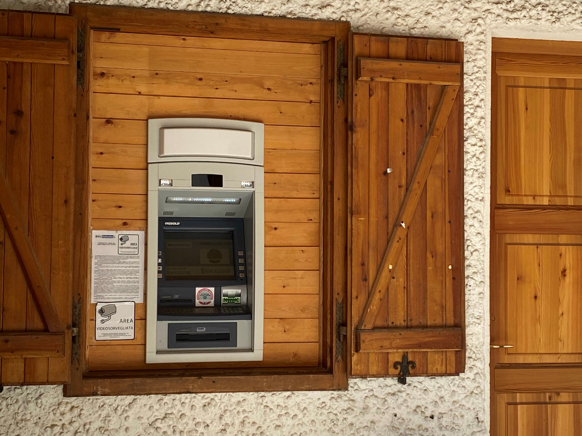 Der Geldautomat befindet sich auf der rechten Seite des Rathauses.