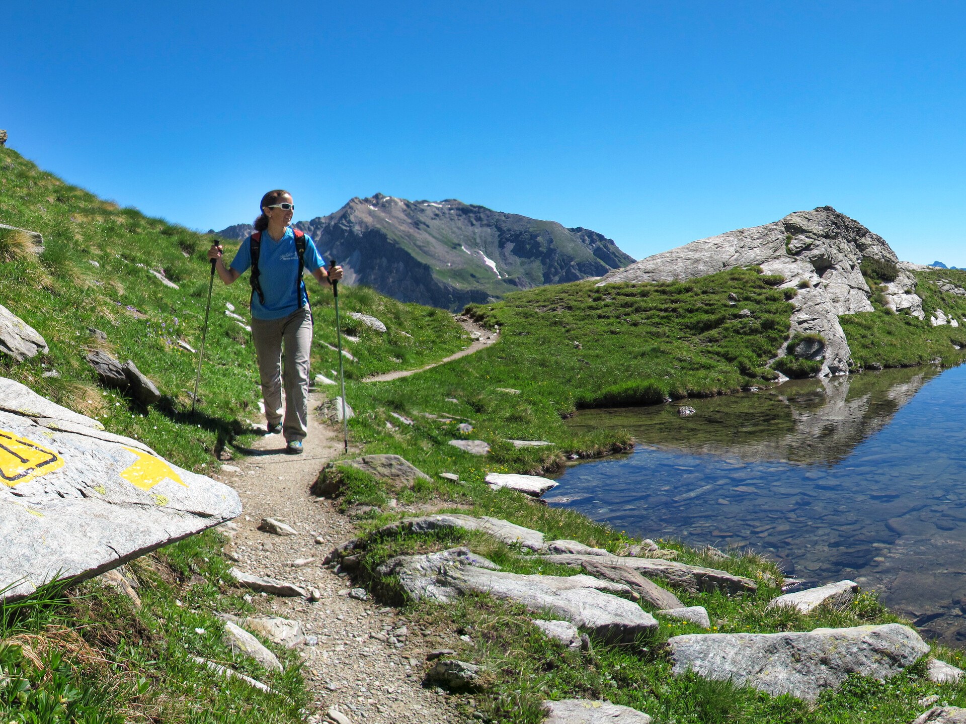 Von hier aus verläuft die Strecke bergauf bis zum Pass Fênetre de Tsan, wo sie zunächst über verschiedene Kehren und dann über eine lange Diagonale auf halbem Hang auf ein Plateau hinabführt, auf dem sich das Biwak Reboulaz sowie der herrliche See Luseney befinden.