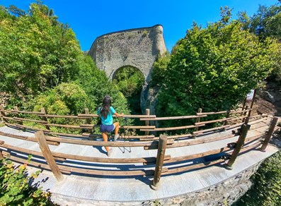 In the hamlet of Porossan, in Chiou stands a magnificent aqueduct-bridge across the “ru Prévôt” canal. It is a magnificent construction in partially plastered stone and lime, stretching approximately 70 metres in length, that allows the canal to flow through the valley below, where the river Parléaz runs, between the villages of Neyves and Serod (Porossan) in Aosta. The bridge gives off a feeling of grandness due both to its stone roof and because of some windows that light up inside making the inside visible.