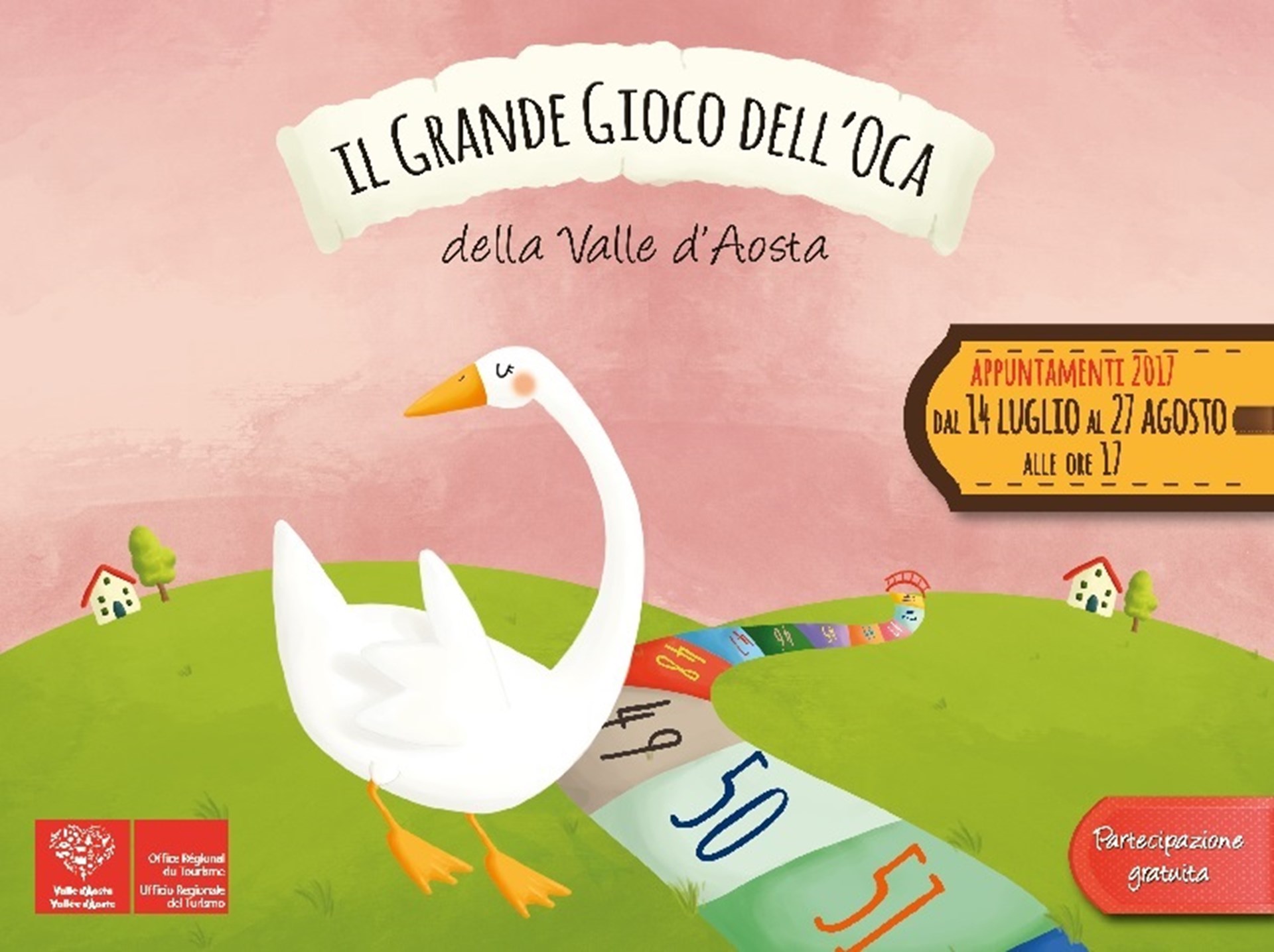 Gli appuntamenti del Grande Gioco dell’Oca della Valle d’Aosta sono alle ore 17.00 nei luoghi indicati (vedi programma) e garantiti anche in caso di maltempo nella stessa località in un luogo al coperto. L’informazione è disponibile presso tutti gli Uffici del Turismo.