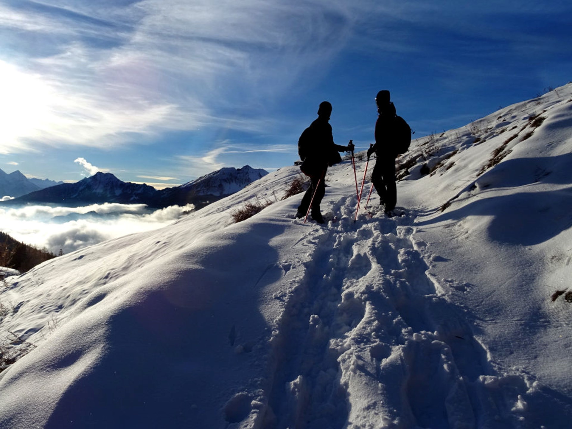Easy snowshoe hike accompanied by the guide Gian Mario. A full-day snowshoe hike to discover that living without cars means living happier.