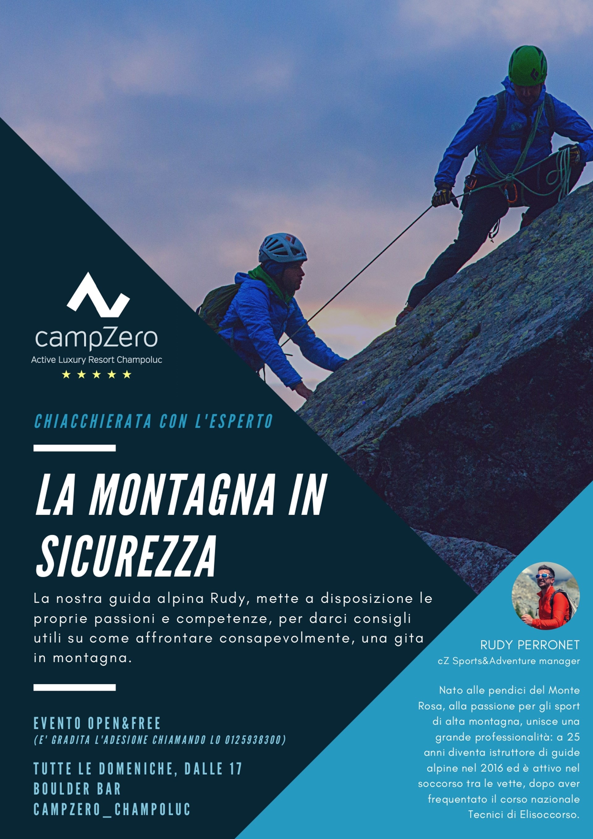 On Sunday afternoon the CampZero Luxury Resort organizes a “chat with the expert”. It is an event open to all and free, of simple comparison with a mountain expert. The idea is to meet with different people on different themes. Let’s start this Sunday with “mountain in safety” - our guide Rudy Perronet will be there. Membership by telephone is welcome.