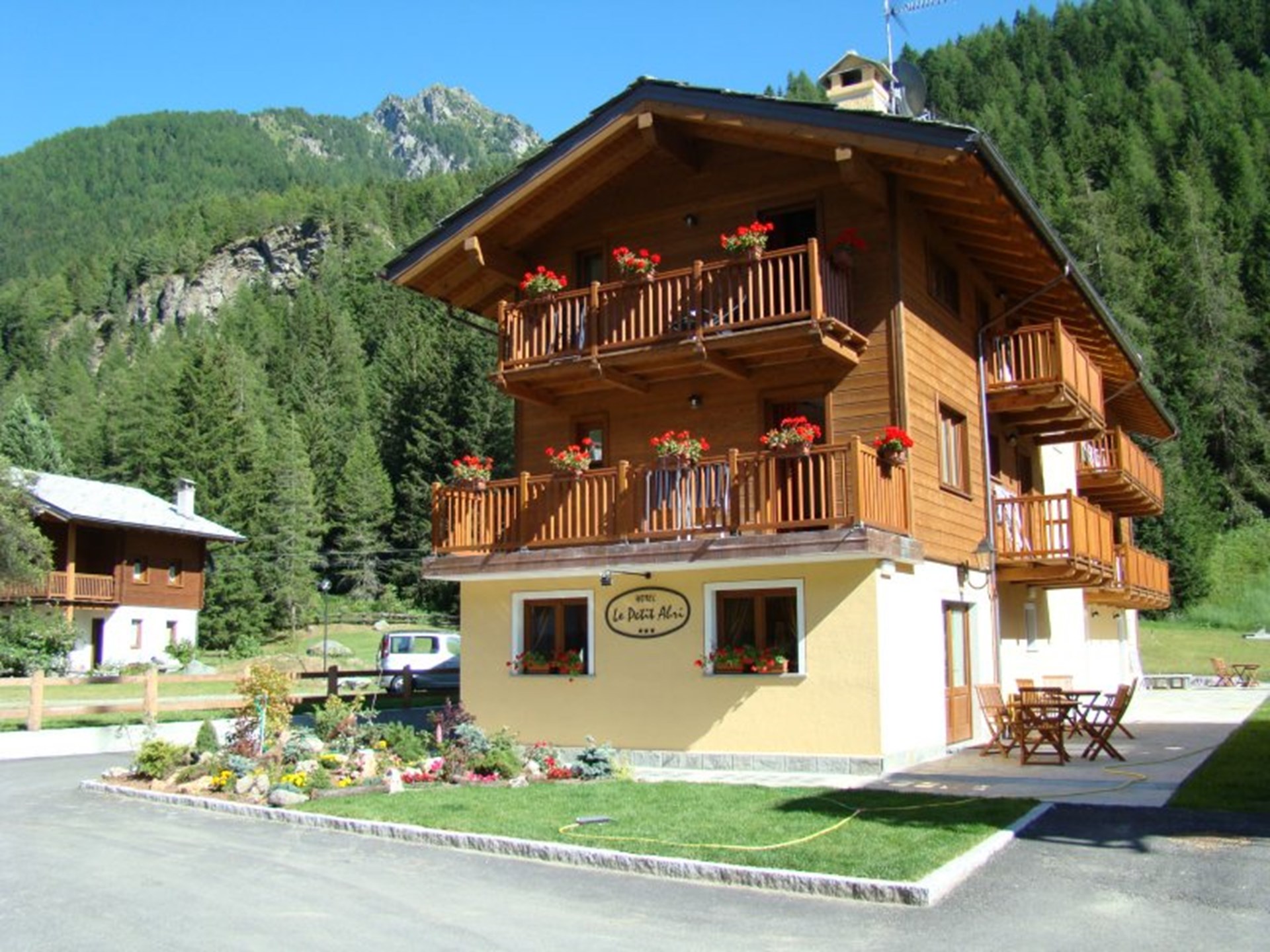 The Hotel is a newly constructed building built in the traditional Alps style and offers 10 warm and welcoming rooms, all with traditional mountain furnishings and fabrics. The Petit Abri is located in the pratone, the meadow area, and boasts a wonderful panoramic view over the valley and the Monte Rosa glacier. It is in a quiet place, 100 metres from the town centre and 1,500 metres from the ski lifts.