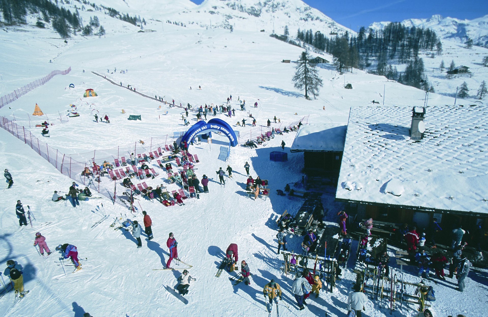 The Baby Snow Park at Antagnod is equipped with games, inflatables and two side-by-side treadmills, one dedicated to skiing and the other accessible to young guests who want to play in the snow.