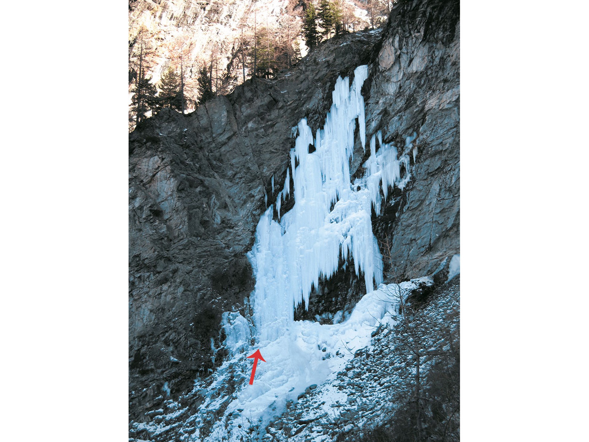 L2: diagonally toward the right searching for the best passage between stalactites and edges. Normally, you can go into a sort of tunnel between rocks and ice (easier), otherwise you have to cross outside on the ice stalactites which are always rather smooth (more difficult). When the ice ends, a fix protects a short mixed passage (M4) which allows you to reach the channel at the summit. Belay on the left on rock (fix and chain).