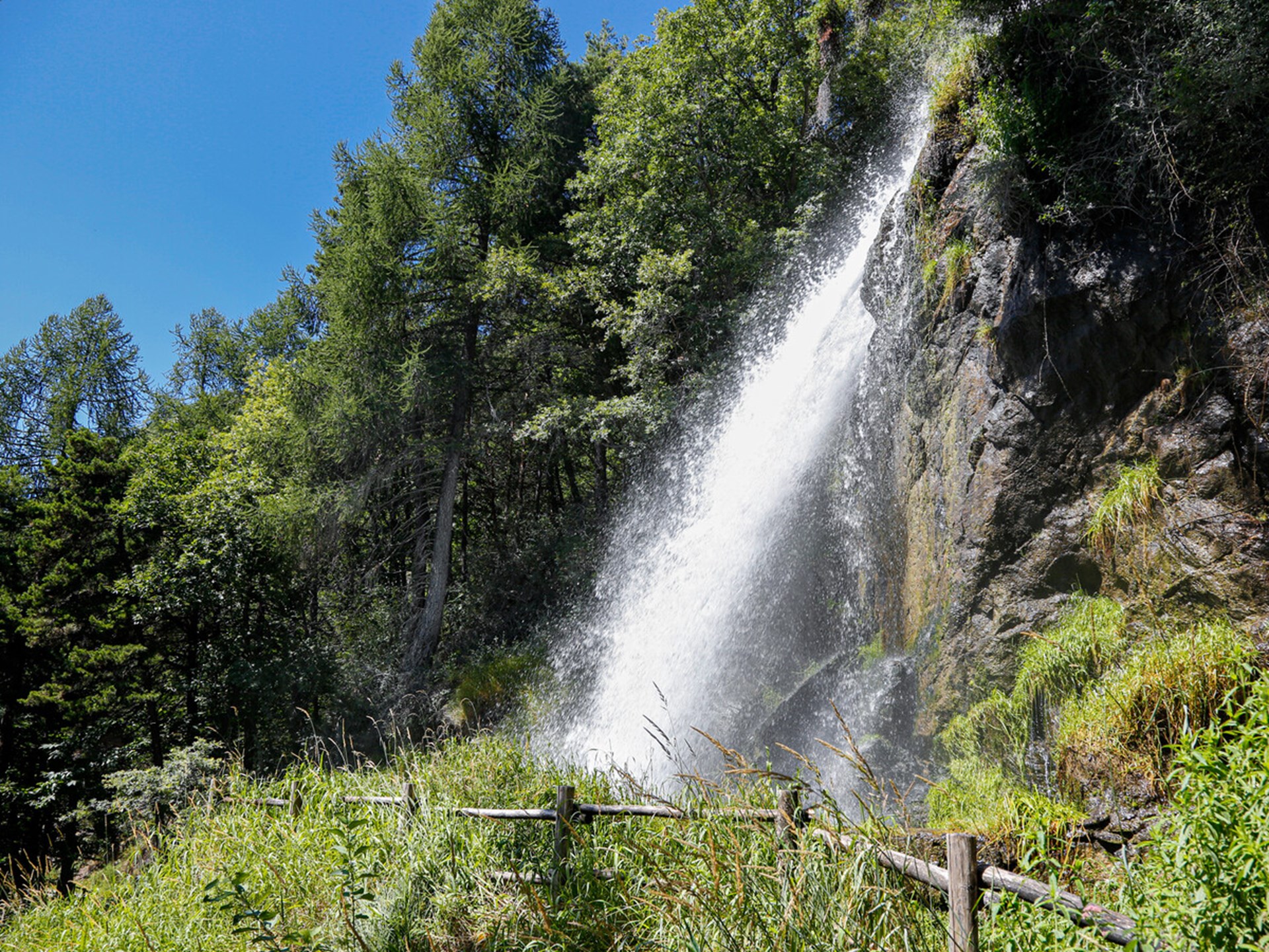From the parking lot of Orbeillaz located at the end of the village, take the dirt track that flanks the Rû d’Arlaz . The path runs along the irrigation channel within a wooded area until it reaches a fork near a conduit; here the track goes downhill, overcoming the pipe through an underpass and then continuing slightly downhill to the beautiful waterfall formed by the Rû d’Arlaz.