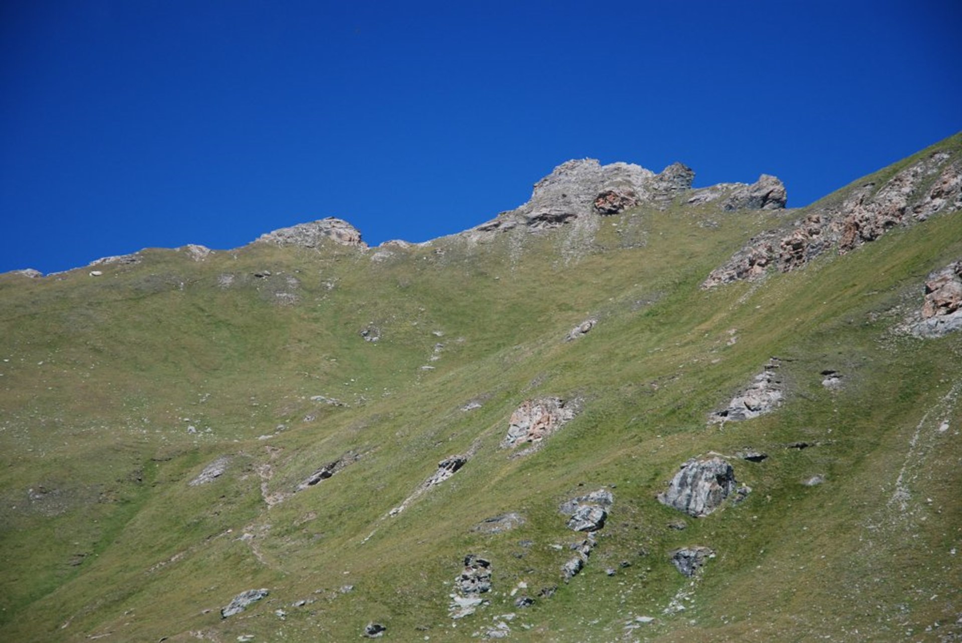 After the basin, the trail gets steeper, goes over a rocky leap and enters a small channel next to the stream, finally leading onto a large grassy basin called Pâturage de l’Aran (2660m).