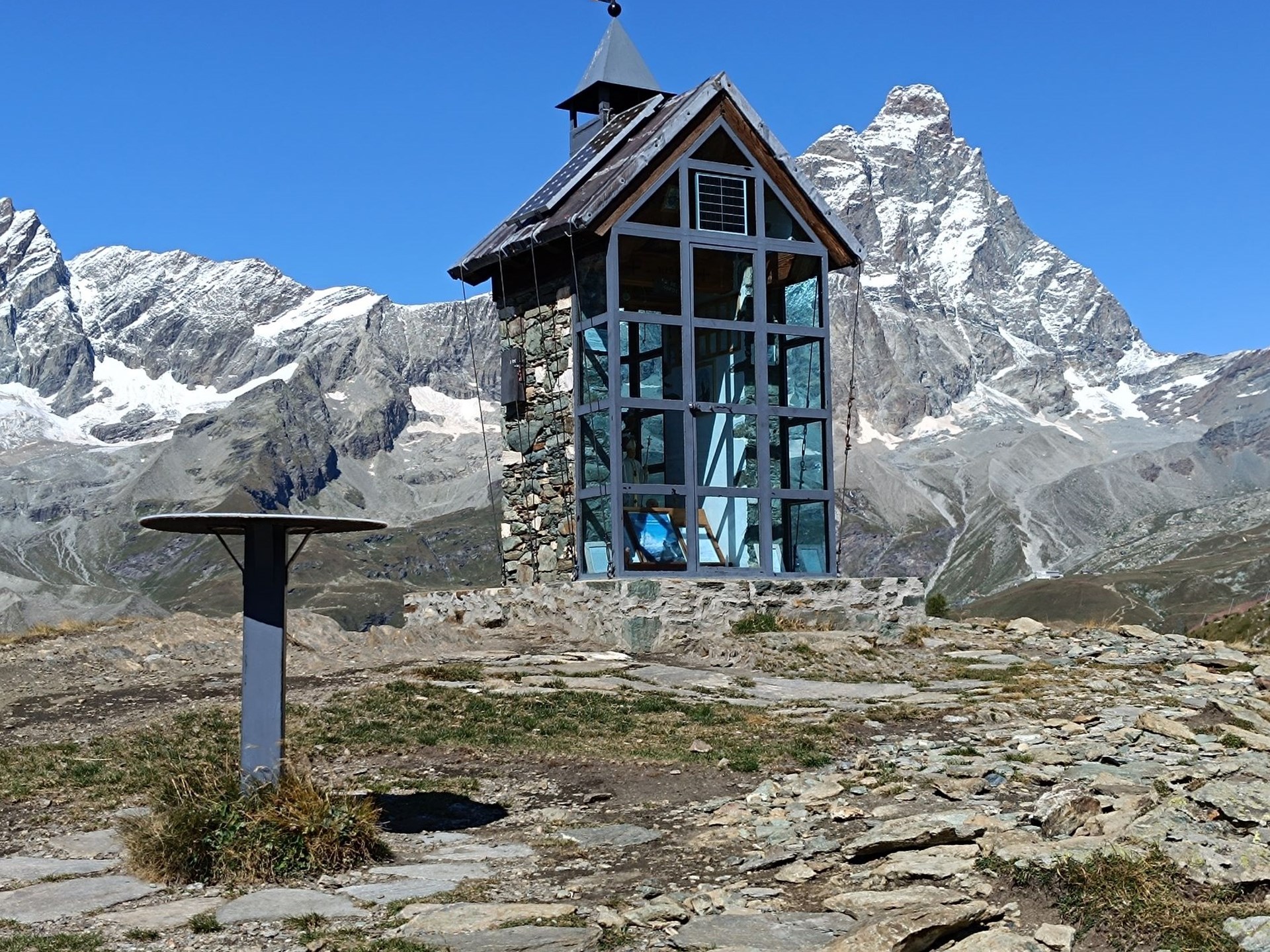 The path starts at the arrival of the cableway Valtournenche-La Glarénaz (Plan de la Glaea) – Salette, turning on the left side and following the track n.107 (Grande Balconata del Cervino) in direction Breuil-Cervinia. After around 1 hour you will find a crossroads, that, on the right side following the path n. 65 (Sentiero J.A. Carrel), will lead you at the chapel in about 20 minutes. Along the way, it is possible to buy dairy products directly to the mountain pasture.