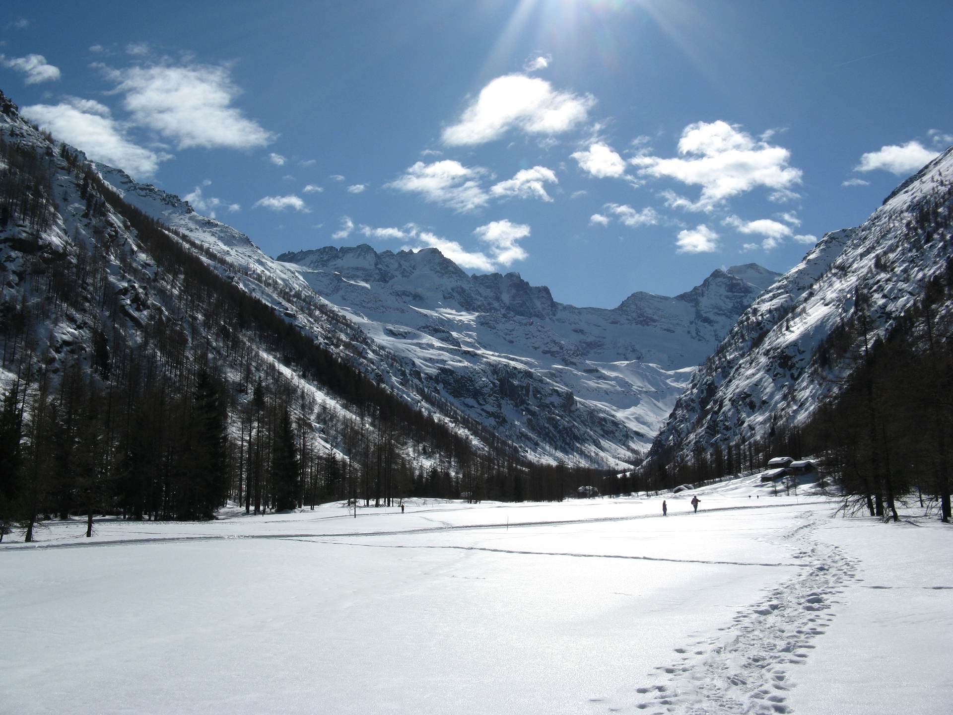 Along the route, groomed by snowcat, there is a spectacular view of the Gran Paradiso mountain and its imposing glaciers. While walking it is likely to see climbers on ice falls.