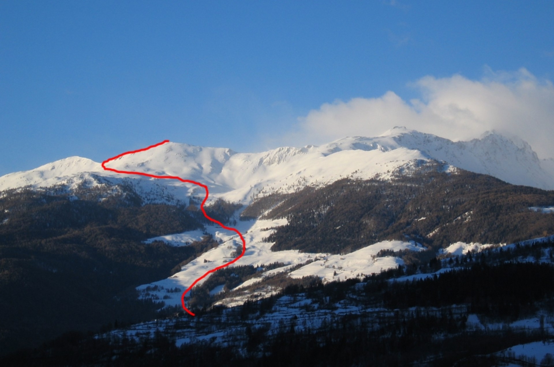 From Buthier 1,319 m, climb the fields above heading South-West to the Rolla pastures, 1,692 m and the Chaligne hut, 1,934 m, both visible from below. Climb the sparse woods over the hut and continue on the open peaks heading for the top. When the slope starts to become steep, turn left and, crossing upward, reach the col di Met, 2,485 m. Follow the wide ridge heading North to the top.