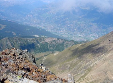 Proceed uphill to Petit Emilius (3342 m) and continue along the ridge, the edge of which is circumvented on the right, first on reddish terraces and then on a more vertical section of lighter, crumbly rock. The via ferrata ends at the last spur. Continue for about ten minutes on moraine to reach the summit.